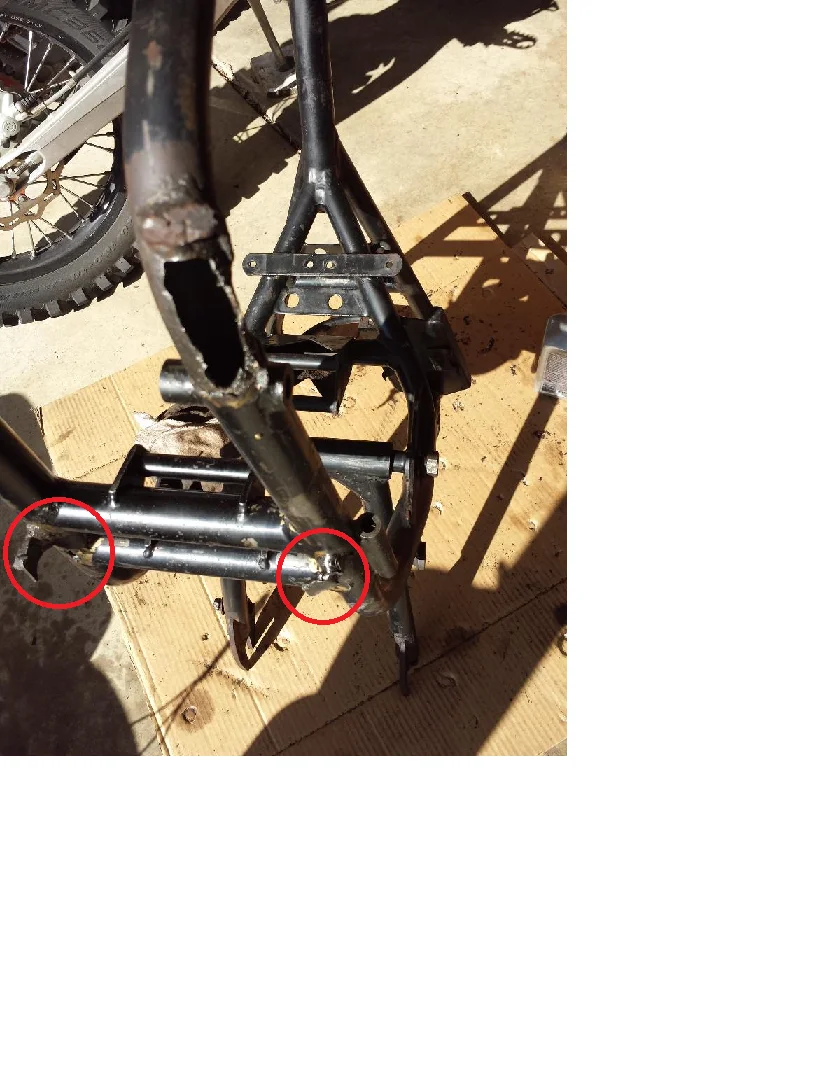 My guess is, the hole in the lower left down tube might have been caused by striking something; and an attempt to patch it failed, with only a big lump of weld material remaining. < ....> And of course, any leads on getting my frame repaired are welcome.