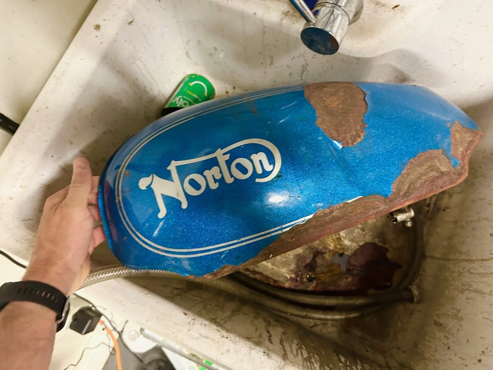 I have a set of original Fire Flake blue tank and side covers. I filled the tank with vinegar, and a lot of nuts and bolts. Over the course of three weeks, I would shake the tank every day and adjust the angle. This removed a surprising amount of the interior rust. Once I was satisfied, I lined the tank with a POR15 tank sealing kit as per instructions. Hopefully it does the job.