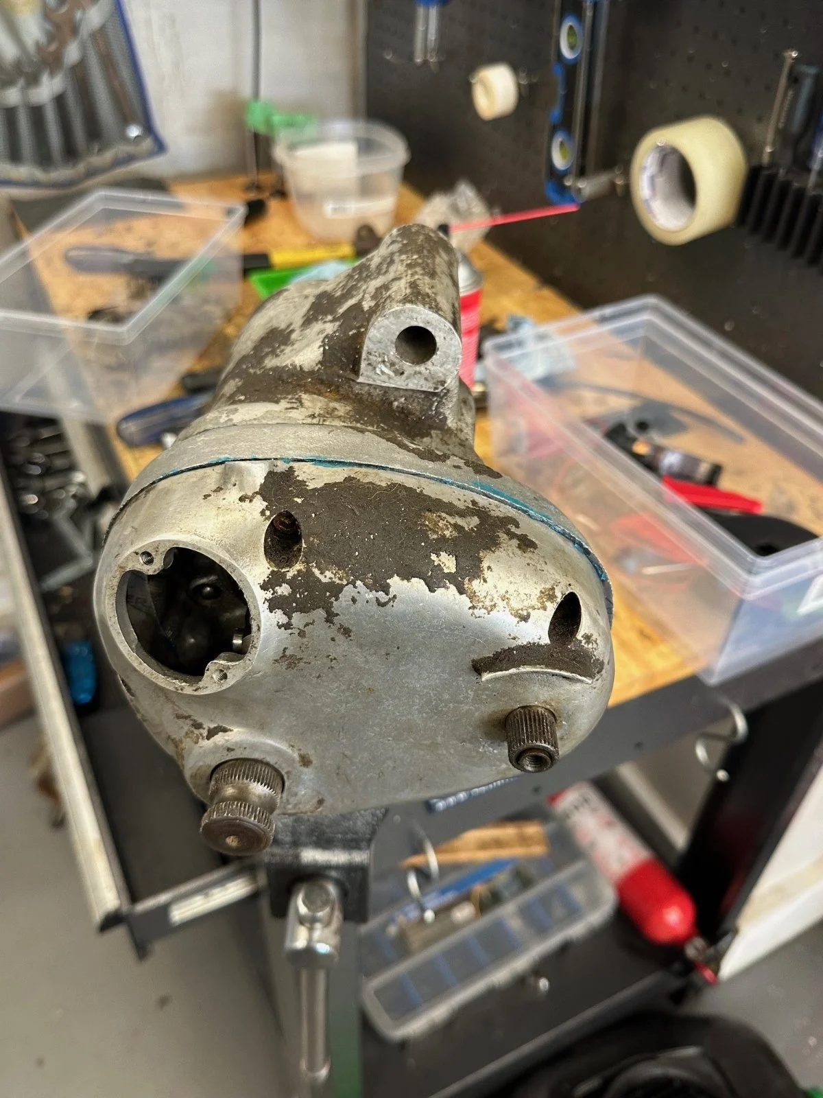 This gearbox was embedded into the dirt floor of a shed for who knows how long. I opened it up, and it was in good shape, and no wear on teeth. I installed a new layshaft roller bearing and new gaskets. There was rust on the inside of the outer cover, so I had to harvest some parts of another gearbox I had. Great care was taken to keep the dirt from the shed floor intact