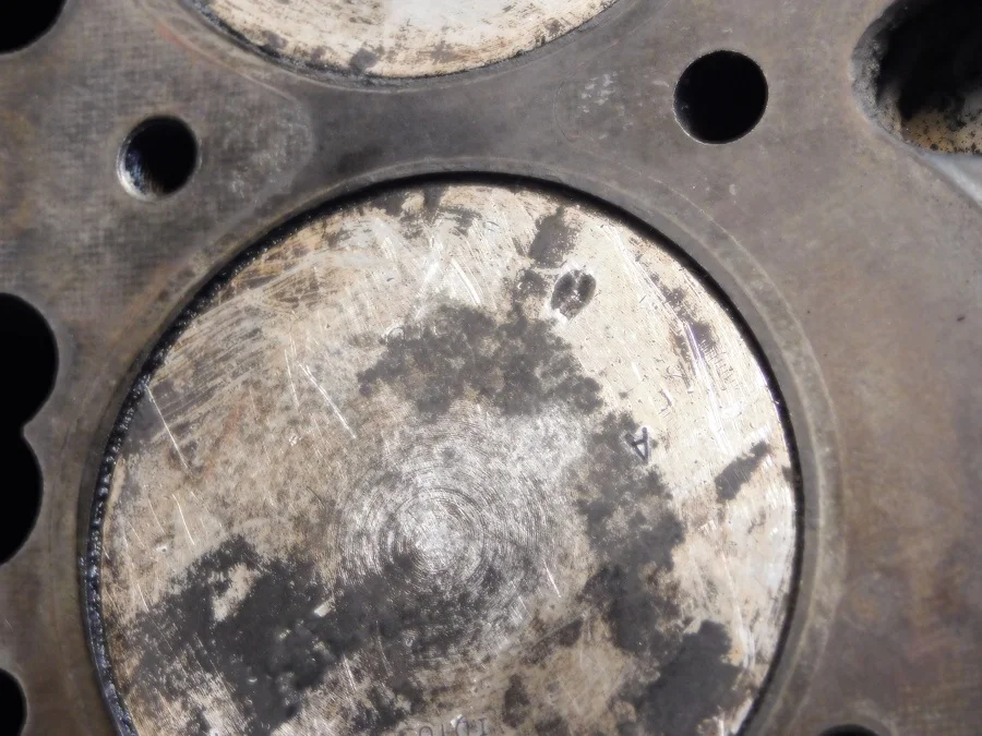 I had to pull the head on my newest project because of a blown head gasket. When I got the head I could see that there was a leak from the combustion chamber into the push rod tunnel. What I didn't expect to find was a divot in the top of the left piston. It doesn't look to be from the valve hitting the piston.