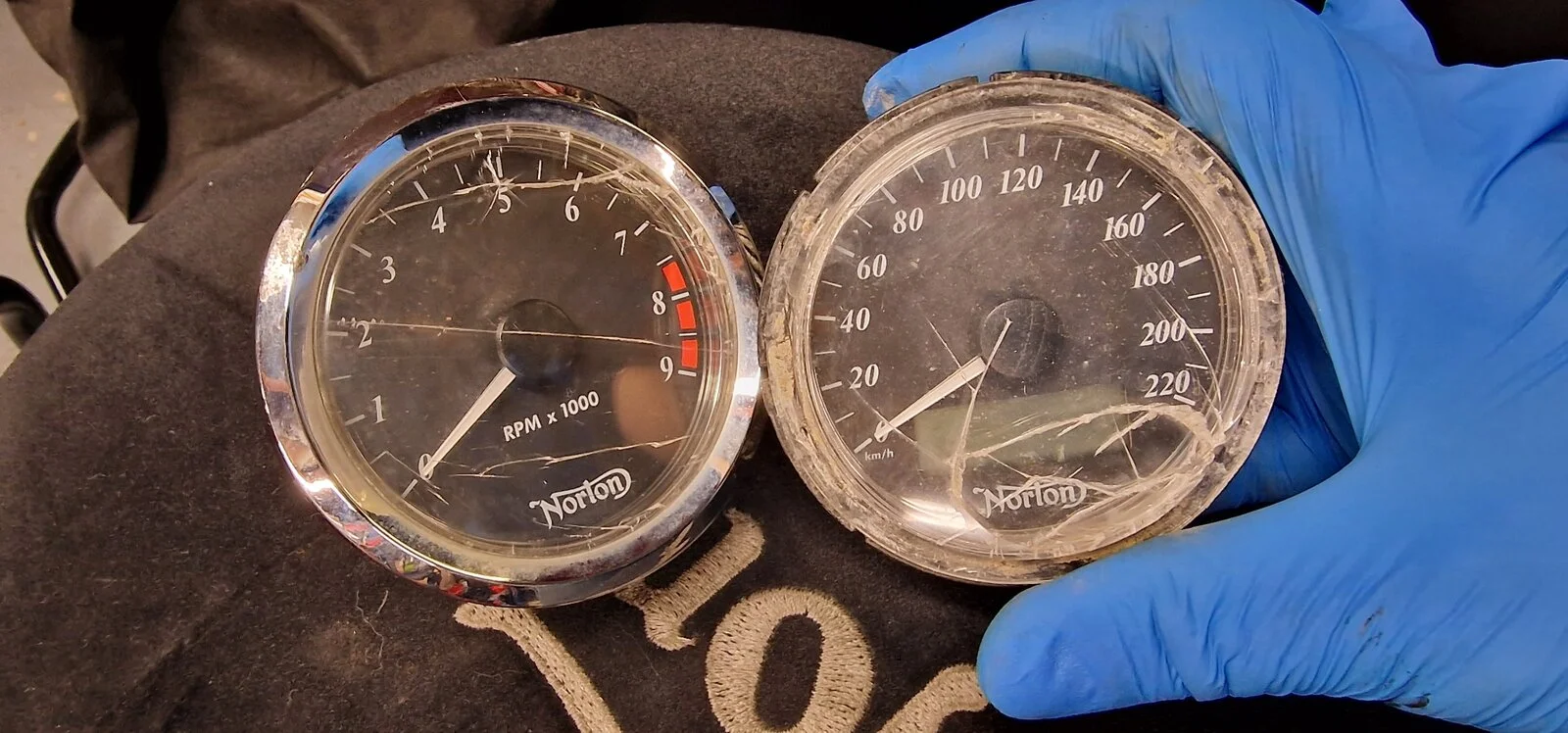 So then, on to the matter in hand. I bought a bike. I bought a Norton 961. This poor Norton 961 though has taken a beating, an undeserved beating....a beating that essentially left her for dead. Smashed up with what looks to have been a hammer and a brick, then dumped under water. Yes, she's bad. The pictures don't really do how bad she is justice. My heart 100% ruled my head on this purchase.