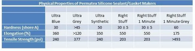 Case in point might be the following table showing the physical properties of Permatex brand oxime-cure silicone RTV sealant/gasket makers (data from Permatex technical data sheets). One might assume at the outset that Ultra Blue and Ultra Grey might differ only in color, or that Right Stuff Grey might be about the same product as Right Stuff Grey 1 Minute. Well, they are certainly not! Right Stuff Grey 1 Minute has only 30% the elongation of Right Stuff Grey and yet has 2.4X greater tensile strength.