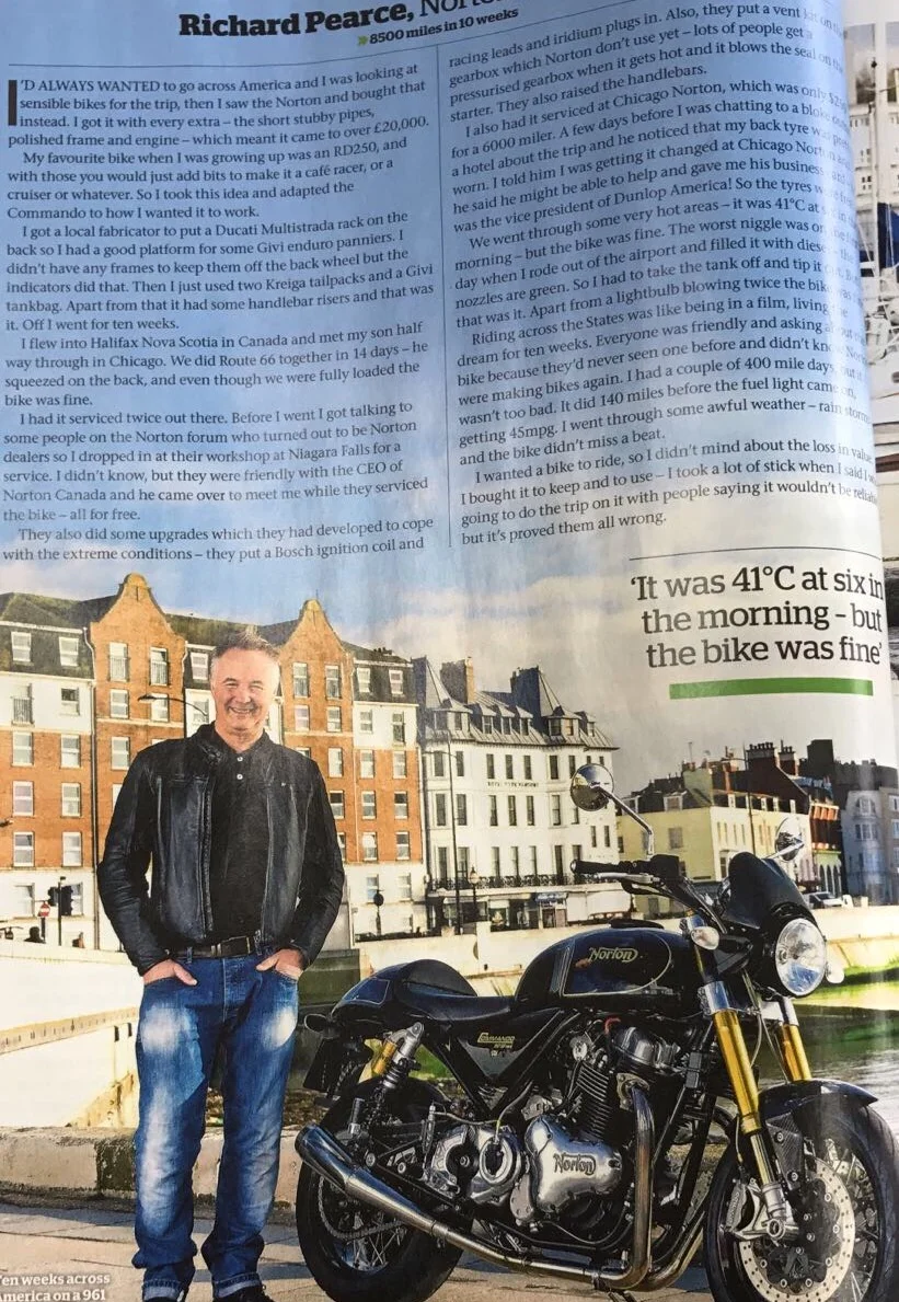 BLIGHTYBRIT/SF said:Excuse me with me Eyes shut,struggling to look as cool as the bike,the photographer that came down to see the bike traveled to each corner of England & Wales for the feature over the course of a week,the bike has only been maintained by Norton factory,Norton Canada & Norton Chicargo MCC, few serviceable items ,last 2 weeks of my USA/Canada trip I stayed on a friends boat in Seattle,spent a week in Bath New York State & a week in Charlottesville Virginia ,so did those 8,500 over 6 weeks of actual riding.