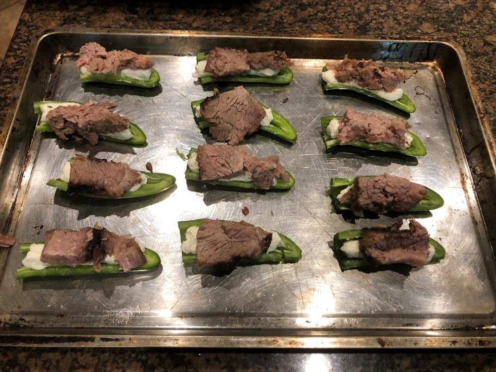 Place a nice lump of brisket on each pepper- (I used 1 LB for 12 peppers) and had a nice couple of bites leftover, plus excess fat trimmed off)