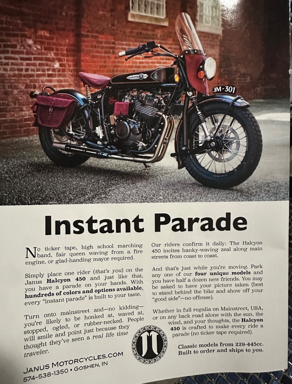 ...it found me, on a magazine ad, back page of Motorcycle Classics.Instead of the snarky criticism of bicycle pedals and poser stuff...
