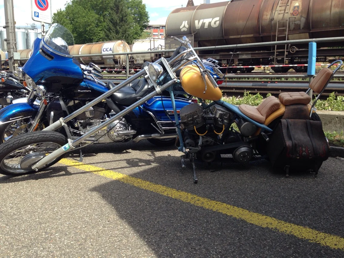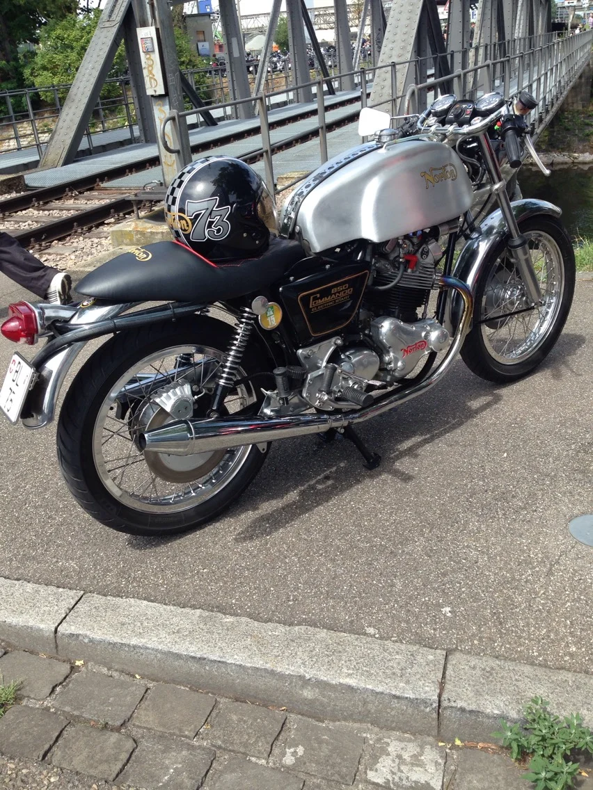 Hi, today I went to Basel Biker Days, was a very nice event although out of the many hundreds of bikes Harleys eclipsed all the rest in number by at least 20 to 1, seriously. New Triumph quitea few, a good turnout of Commando ( mine and one other) The chop is for Cliffa as he knows first hand the drama of having any modification approved here. It is from Germany and perfectly legal to ride on our roads. Bizarre.