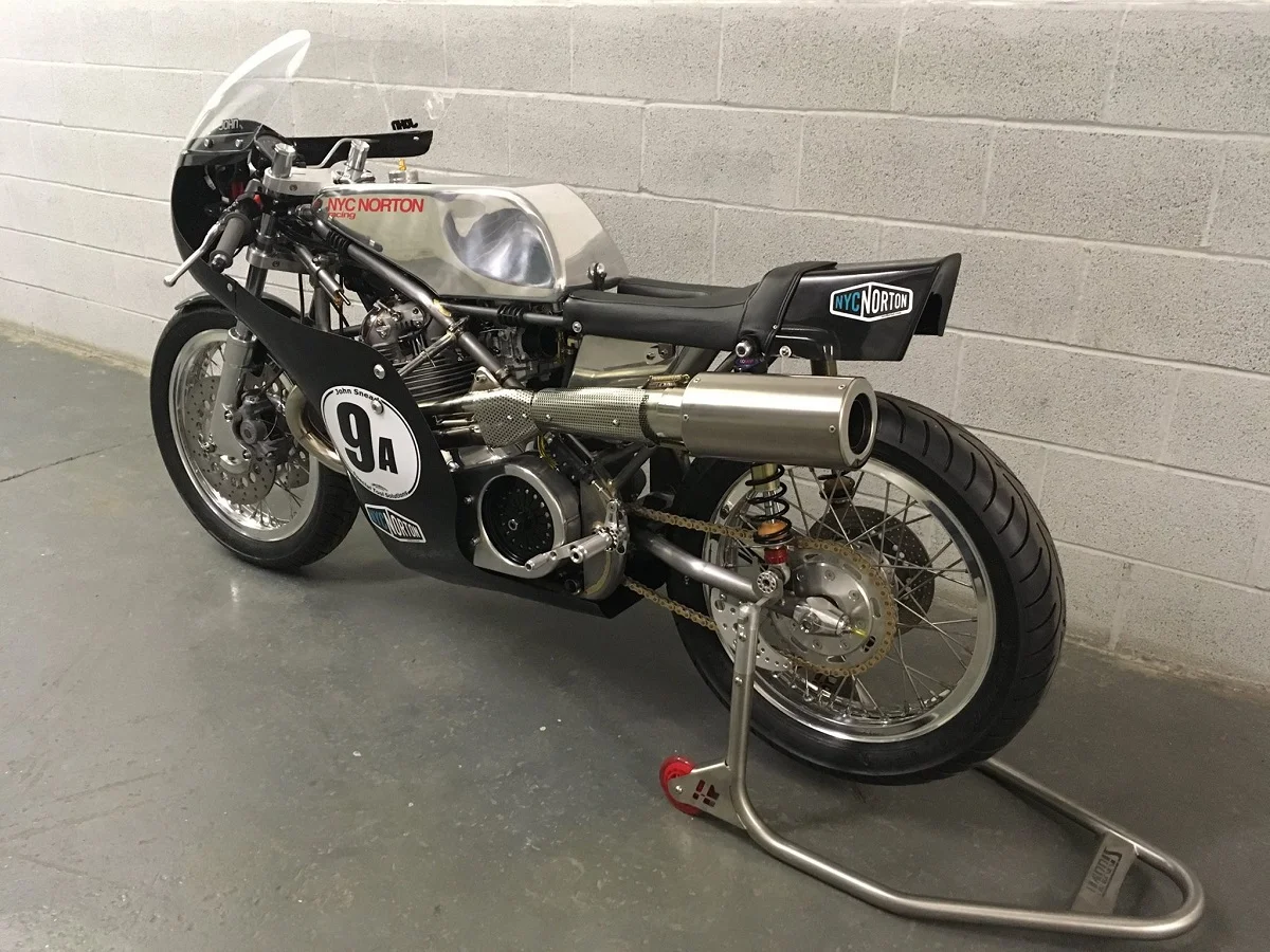 Roger Titshmarsh Seeley MK2 Replica chassis fabbed from Renold 531 tubing. (Motor details separate). TTI Magnesium 5-Speed Close Ratio Gearbox, Keihin CR35mm carbs, custom stainless 2-into-1 exhaust, modified and lightened Commando clutch, Triumph T140 Billet rear hub with cush drive. Production Racer front hub with 11.5" drilled disks and full compliment of sprockets. NYC Norton lightweight yokes, Roadholder forks with Cosentino shim-stack internals. Seeley MK2 Tanks and MK4 seat. Kirby Fairing. Avon tires. NYC Norton rearsets. Bike weighs ~295lbs dry. It is the sister bike to NYC Norton's 4x championship winning Seeley Commando.