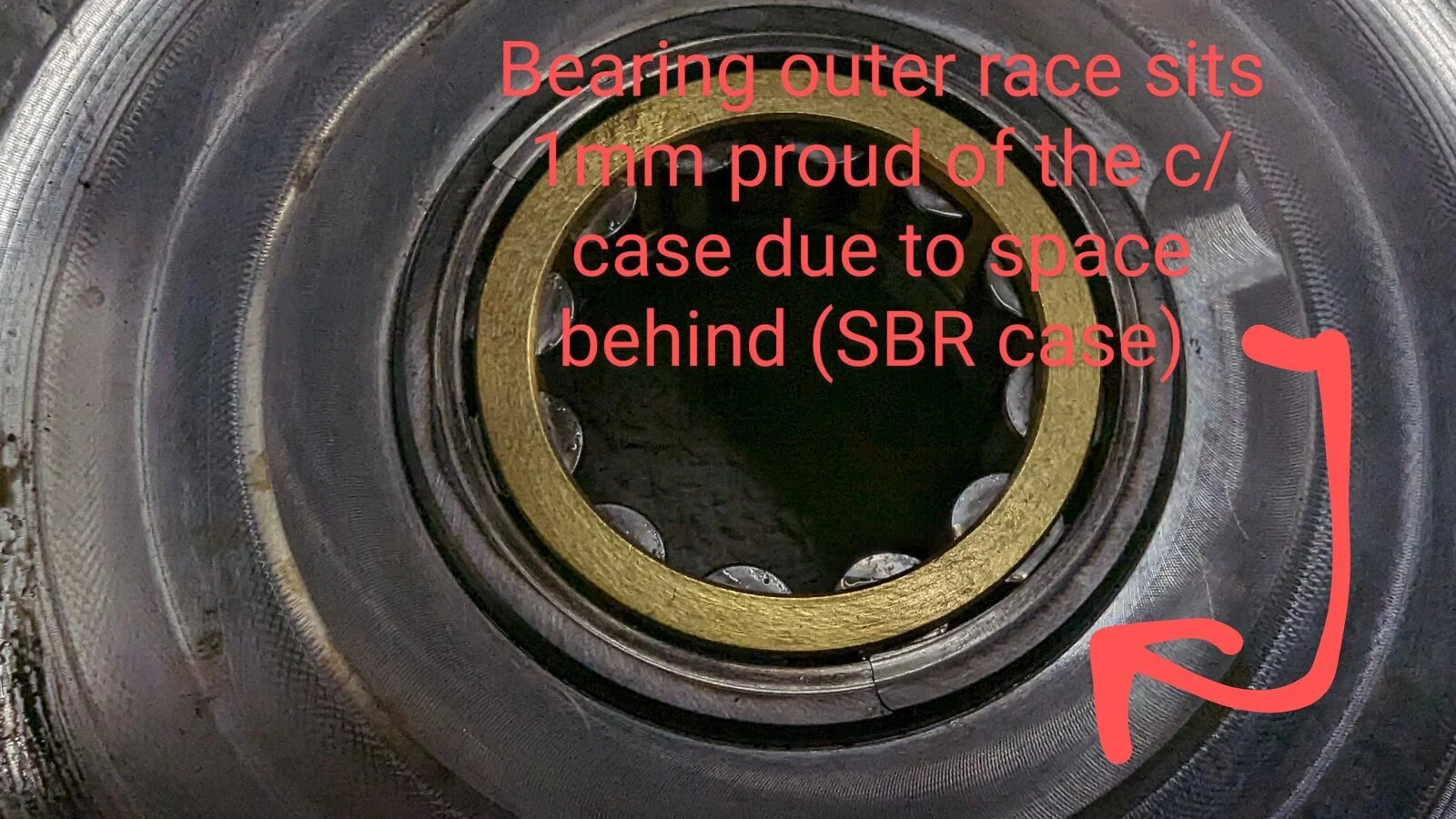 I'm 99.999% sure that the spacing issues are totally the result of adapting a custom made one piece Pre MK3 width crank into custom made SBR cases which require either the 3mm wider Mk3 crank, or that 3mm clearance shimmed in some fashion. Because I fitted shims behind bearing outer (in the case), each outer now protrudes from it's bore by approx 1mm. You can see this in the uploaded photos This outer race protrusion doesn't /can't happen in a stock crankcase. With a stock crankcase the main bearing outer race sits either flush with or below the crankcase.