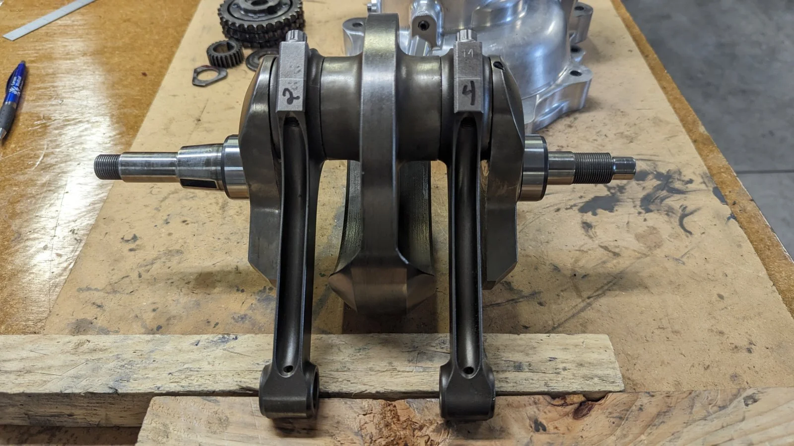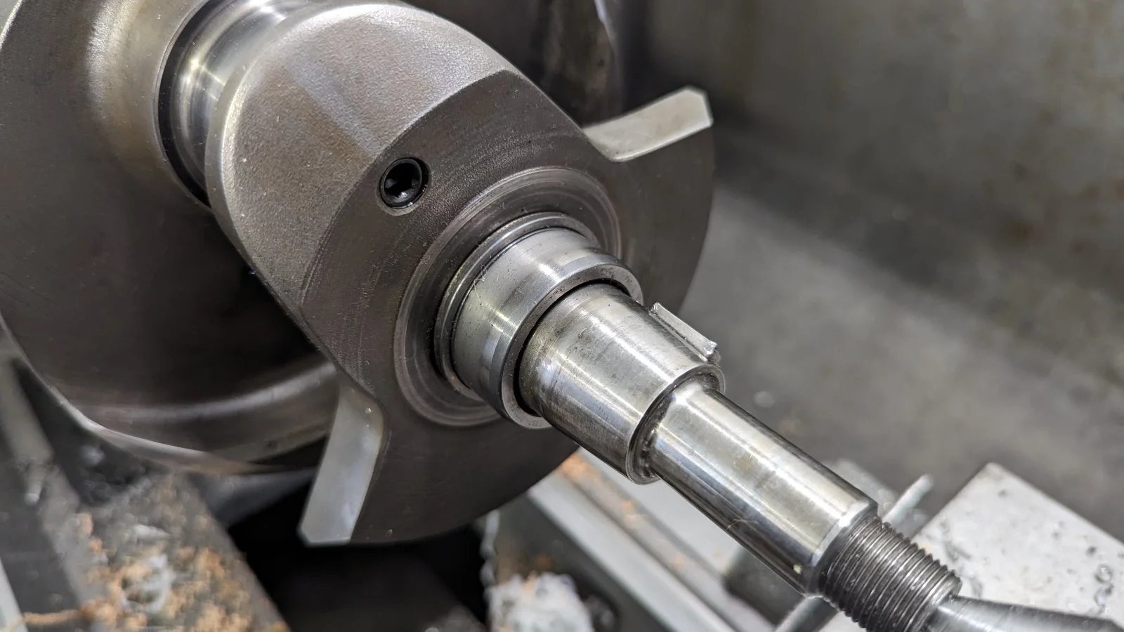 We chucked the crank up in the lathe and turned 20 thou from both timing and drive side bosses on the crank - so reducing the width of the crank between these two points by 40 thou total.