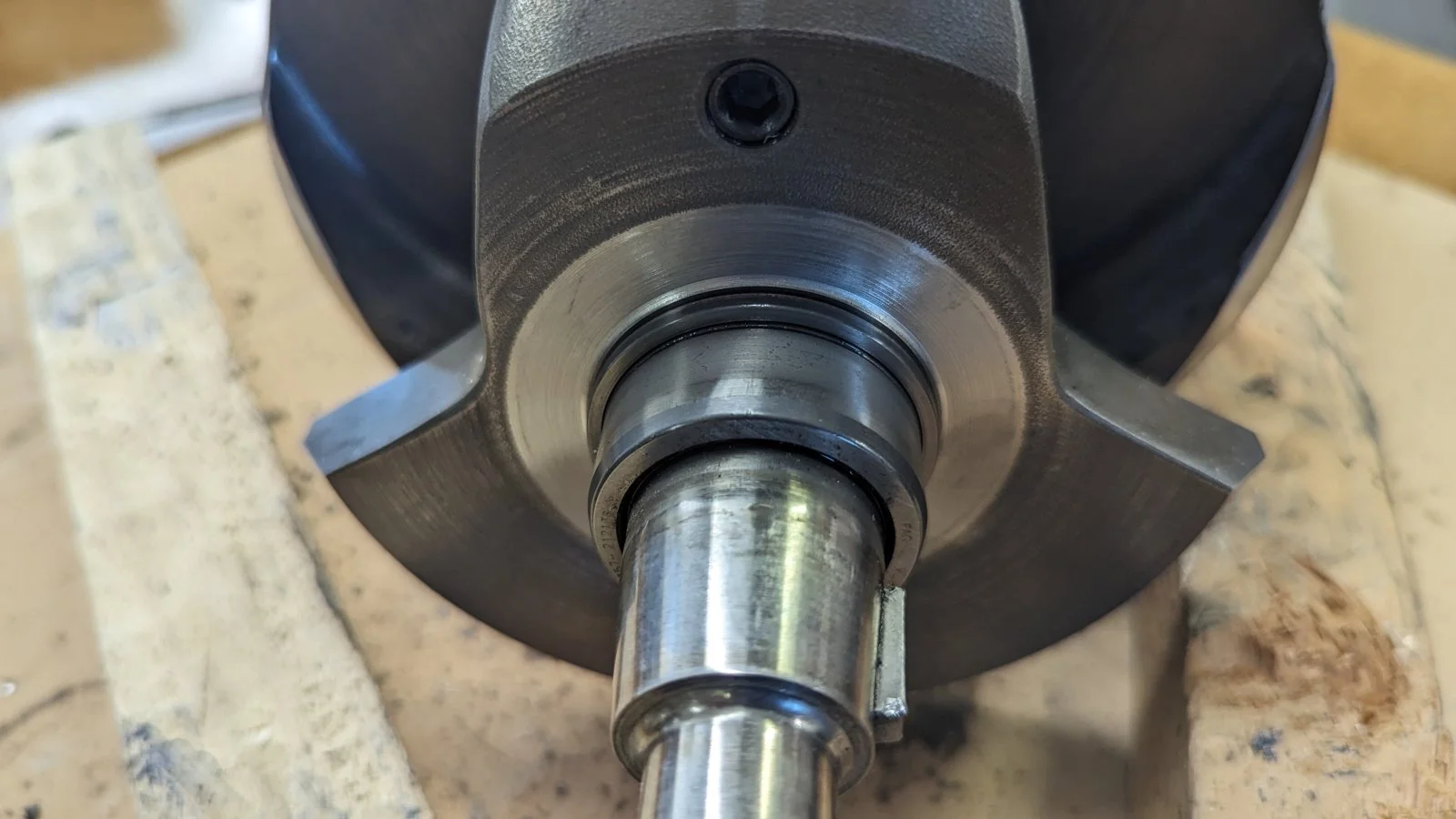 We then fitted the new inner races to the crank., but before fitting the inner races we ground a small chamfer on the top edge of back of the inner race to facilitate easier removal with a bearing puller in the future. It makes it so much easier..
