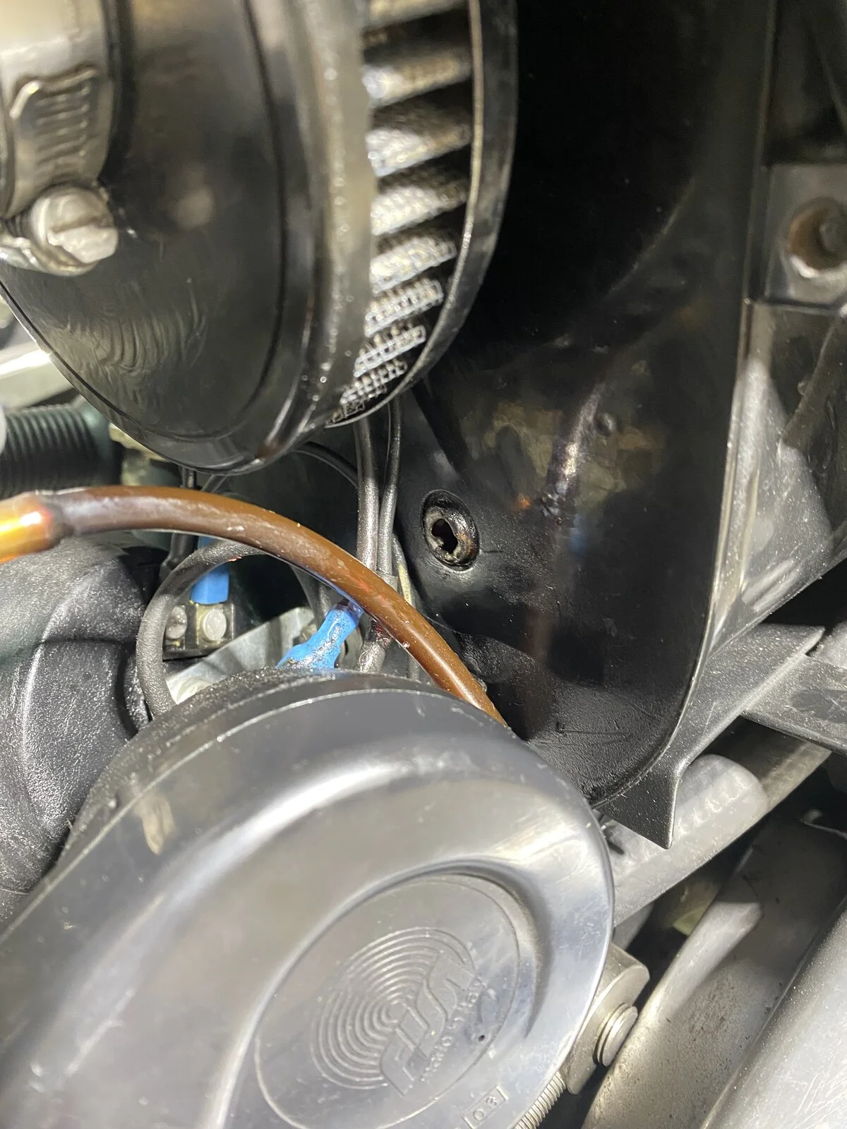I think there are multiple leaks going on with the bike. After the first ride since installing the breather, the bike still leaked from that breather hole. I checked the oil tank level. I had filled the oil tank as usual so that the dipstick showed half way between the bottom and top indicator lines. It seems this was too much oil and the leak persisted. I extracted about half a liter so that the oil level was just touching the end of the dipstick. This alleviated most of the issue.