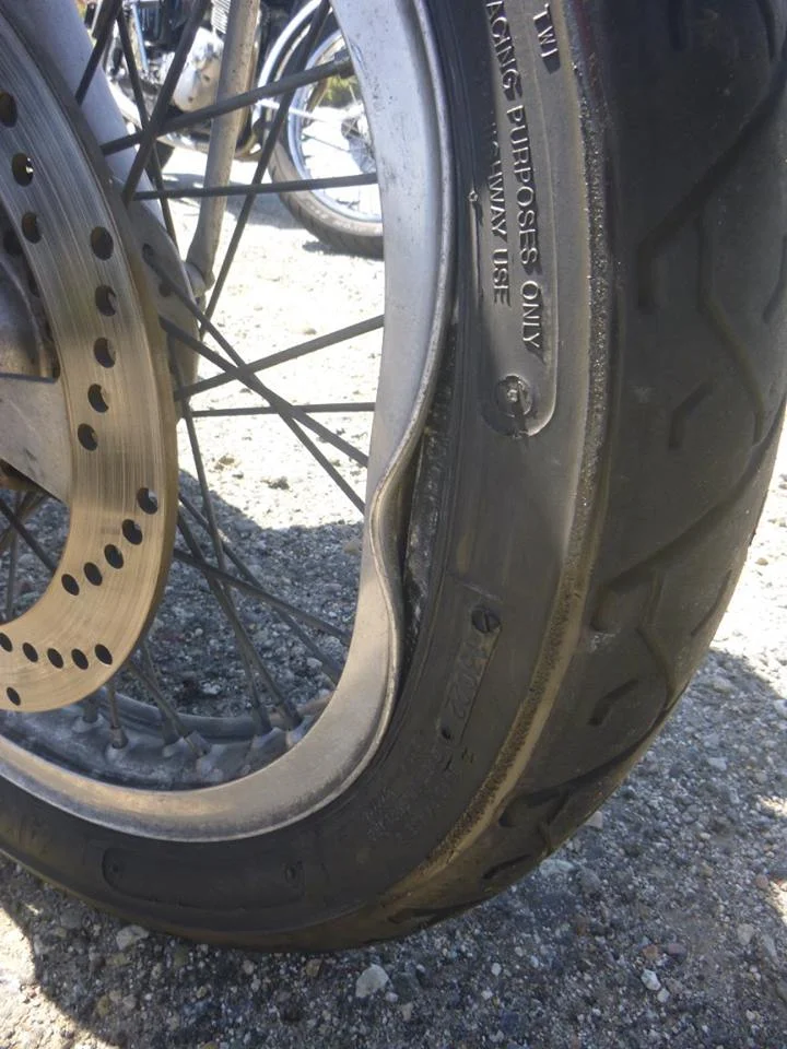 Here´s a Photo of the rim, the cracks are marked with red. As you can see all cracks are on the same side, the brake side. Looking at the holes, they´re not drilled in the same angle left and right side, so I´d say they´re drilled specially for the Commando rearwheel. However, they´re not 100% straight, but not far off.
