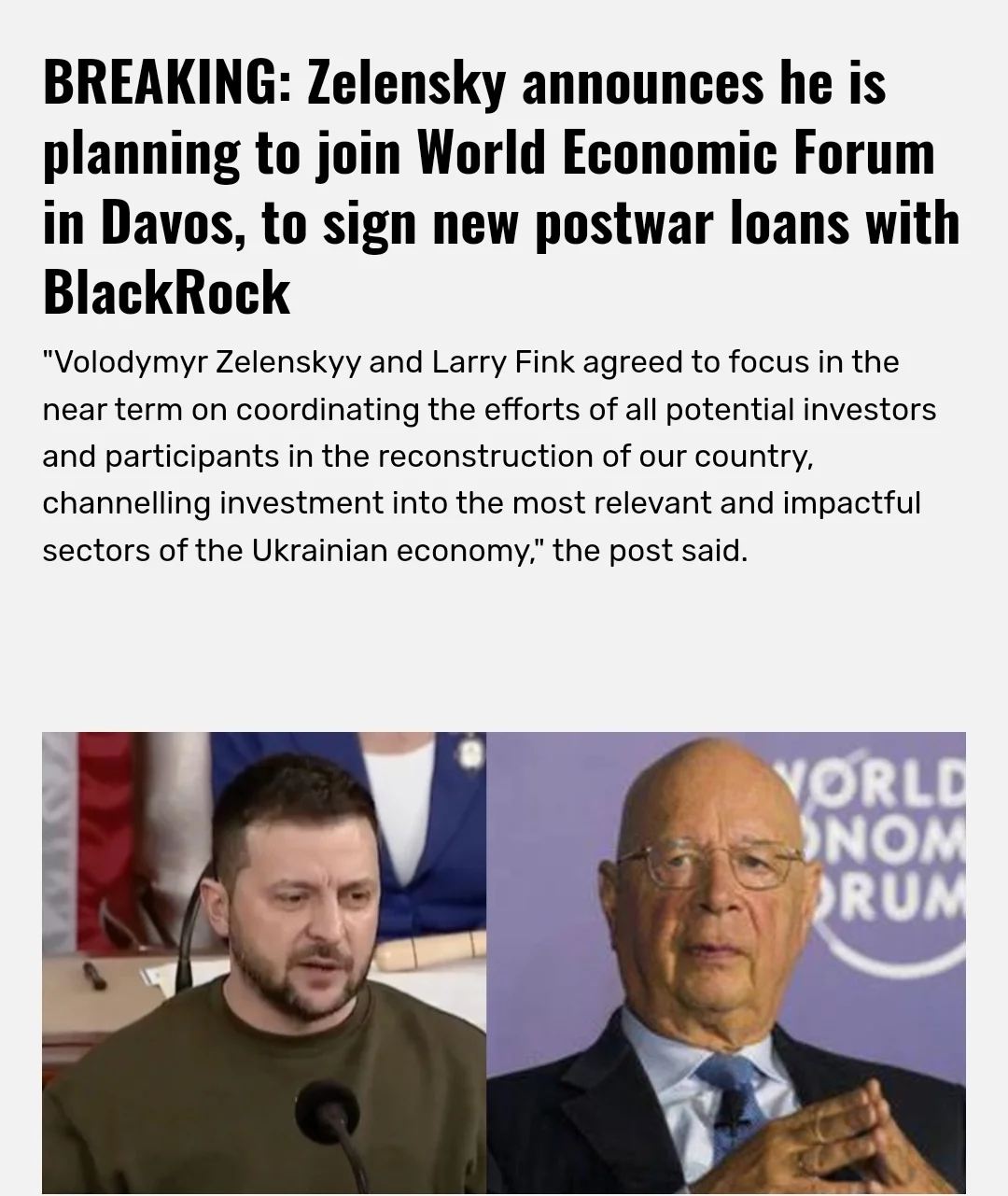 BREAKING: Zelensky announces he is planning to join World Economic Forum in Davos, to sign new postwar loans with BlackRock