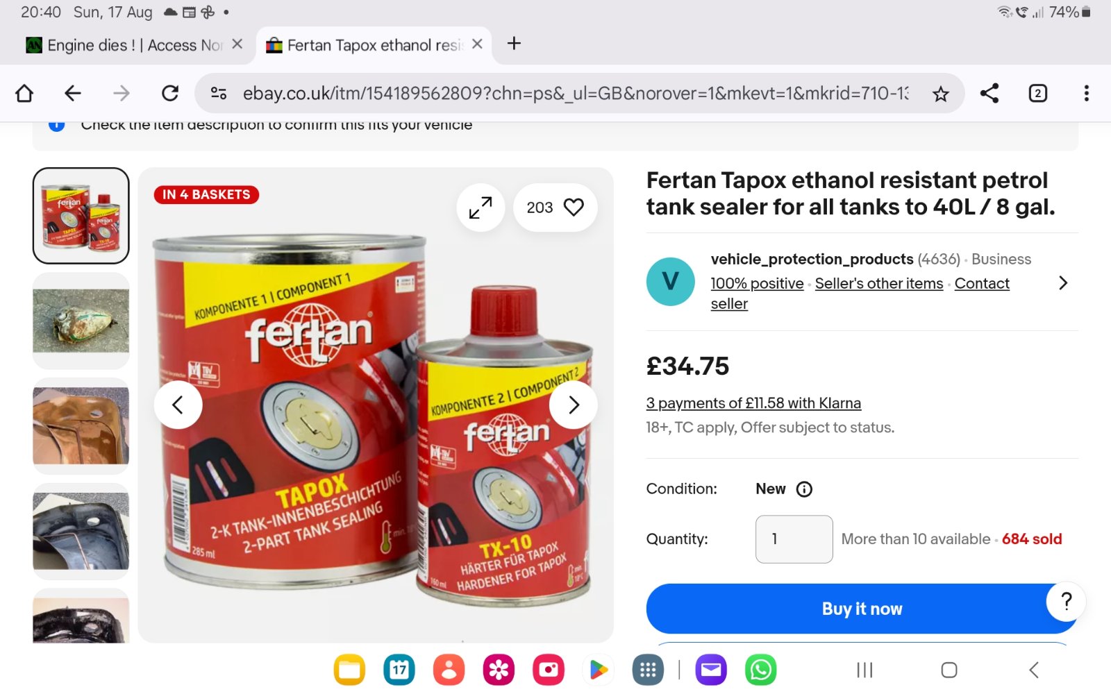 Good call. I had a friend that would call me like clockwork every few months because his T140 wouldn't run right and I'd clean out his idle jets (again.) Turned out it was his tank pealing from a dying Kreem coating. I actually checked for fuel contamination but it was so slight I missed it. I've had good luck with "Redkote" which is quite easy to work with and can be removed easily if you change your mind with acetone or MEK. Mine was actually coloured blue.That's why I posted.