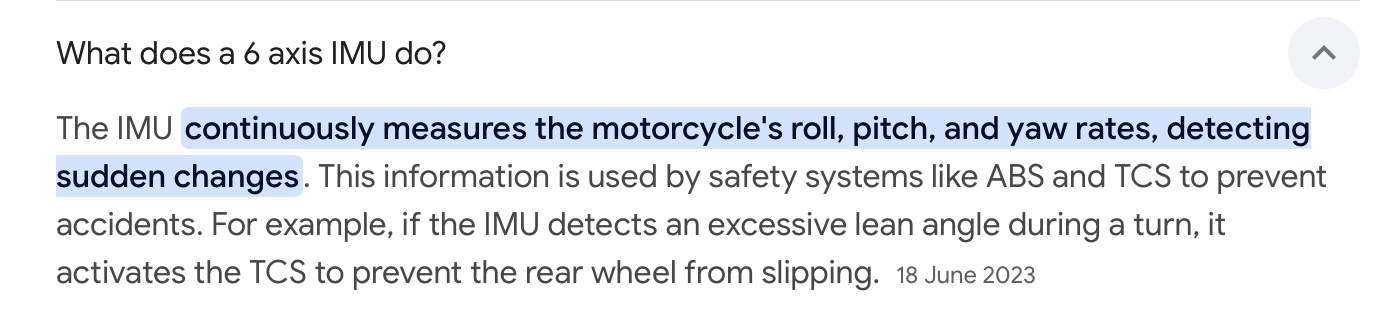 A six axis IMU facilitates ABS and Traction Control apparently. Both worthwhile tech facets in given situations.