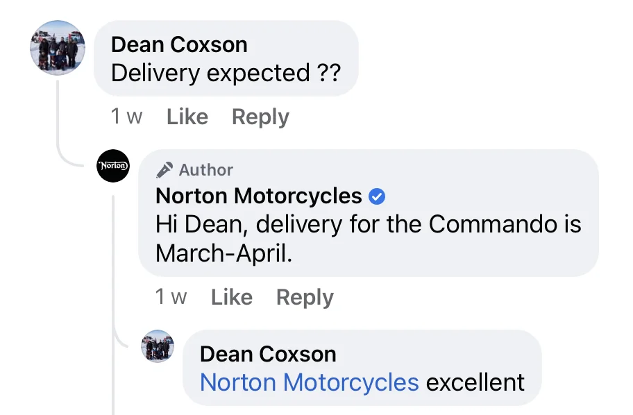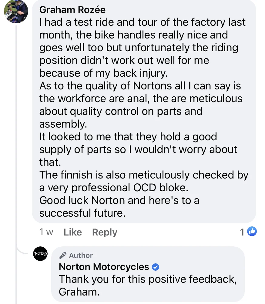 My guess is that Birmingham Norton is trying (really) hard to ensure that delivery and subsequent support is as successful as it can possibly be. Delivering an almost identical bike to a model that had previously failed would seem to necessitate this.
