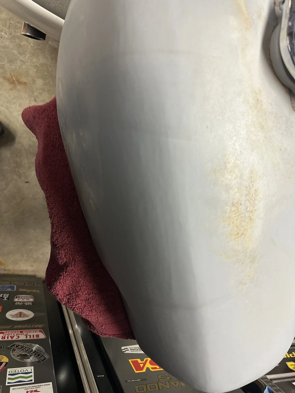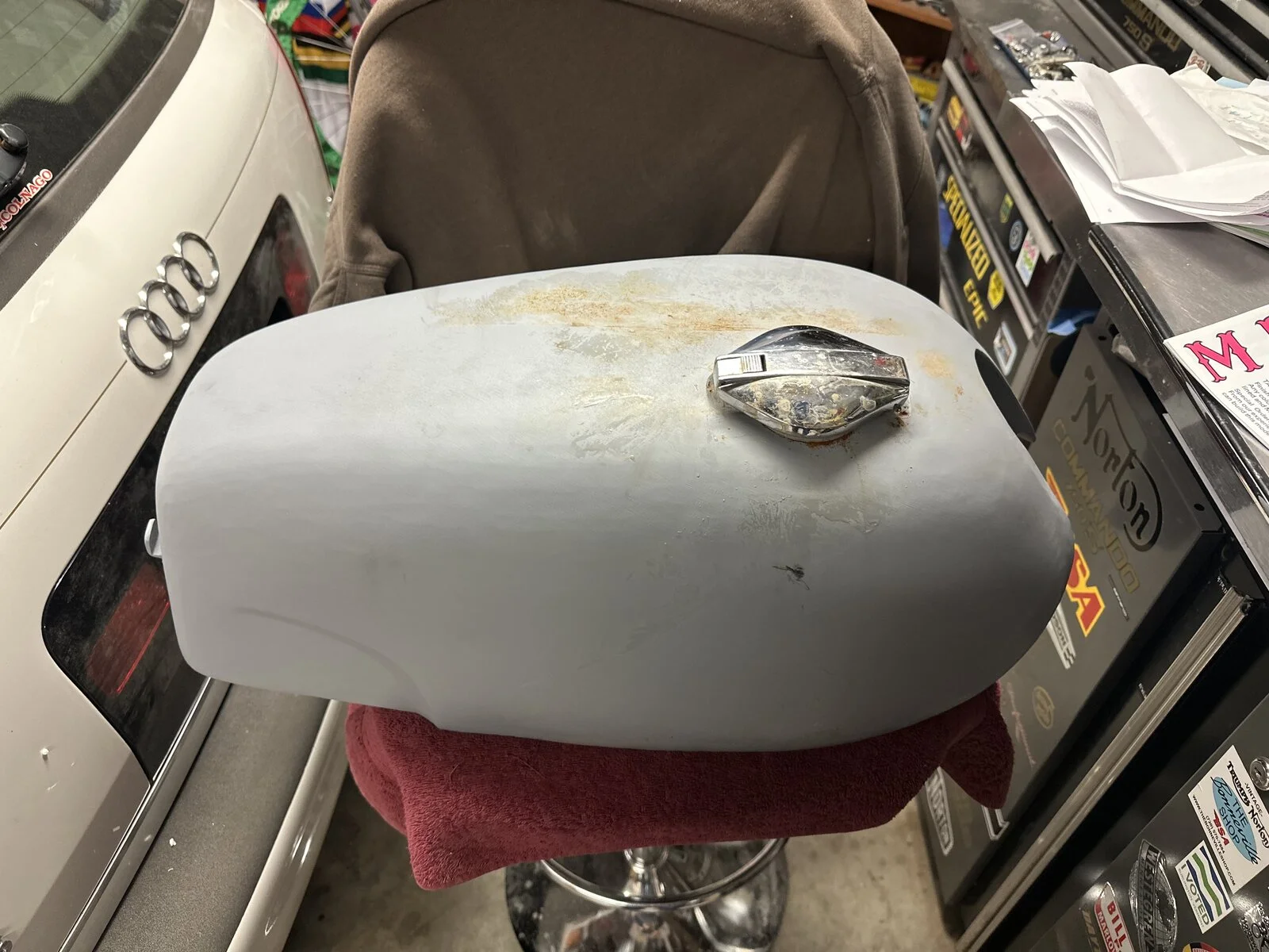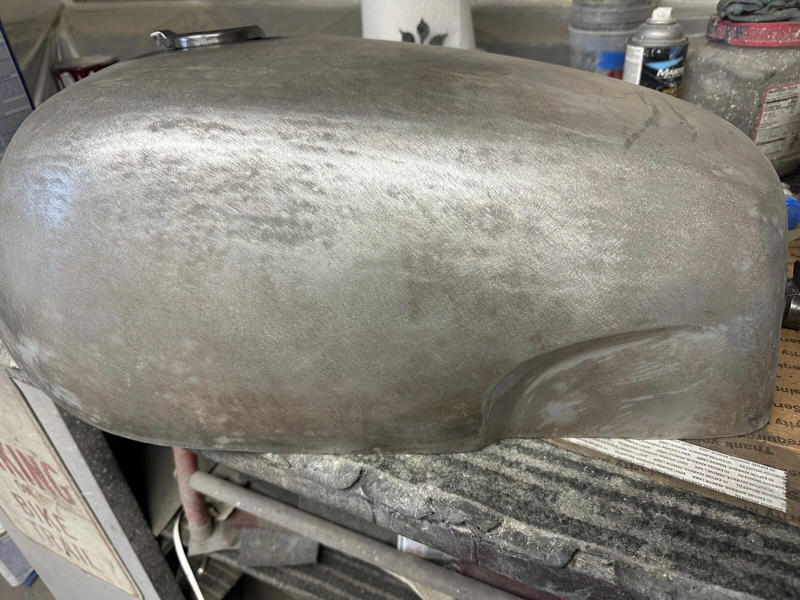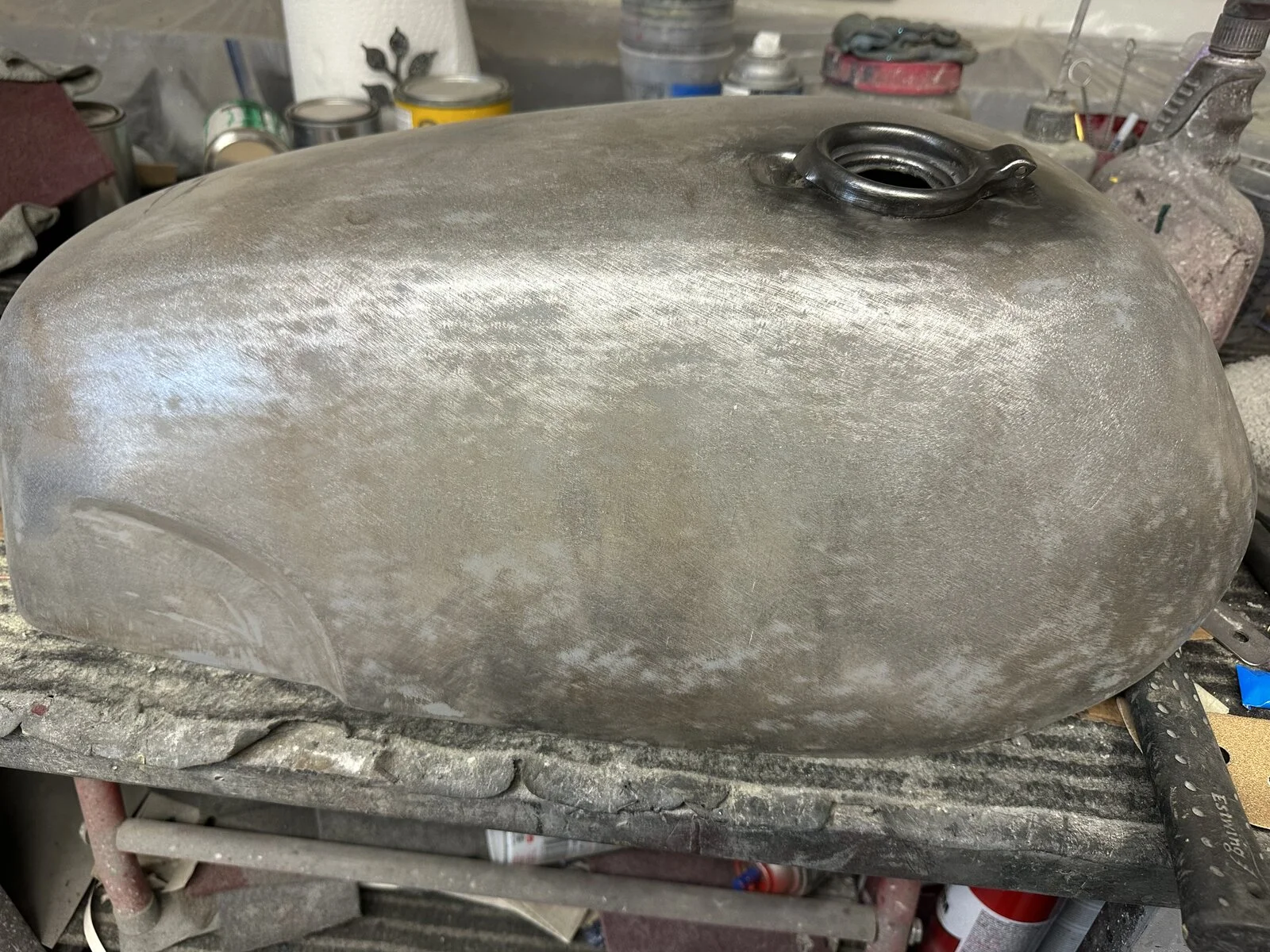 Well, here are only a few pics of my tank that just arrived from Royal Choppers. As you can see it is primed, then in a raw, stripped state. Plenty of surface rust bleeding out on the primed pics. Plenty of body work to be done for sure after the primer was chiseled off. It was packed well and shipping was surprisingly fast despite having to have re-made the tank twice after purchasing. I have to say that correspondence was very fast and extremely polite the entire time. The first tank resembled more of a beach ball shape and not a fastback tank. When pics were sent to me for approval, the dimensions and proportions were pretty far off. It was not sleek or curvy. It was just a vague shape that sort of resembled a Norton tank. The front end of the tank was rounded off and didn’t have that point at the front. After exchanging several detailed pictures and measurements from my fiberglass tank he arrived at this. I will applaud the effort, but mind you, these are pictures taken by my painter who lives across the country from me. I have no first-hand knowledge other than what I’ve been given. He knows Nortons well enough. That said, he decided that this could be worked with. It will raise the price of his work considerably due to the amount of work needed to make it right. Prep is 90% of the finished product. Take away what you will with this. There are many good things to say about RC, and some areas that could be improved upon. I’ve yet to see a finished product, but knowing Brent’s work, and he’s done a lot for me over the years, it will be beautiful. Emgo could stand to reproduce this model.