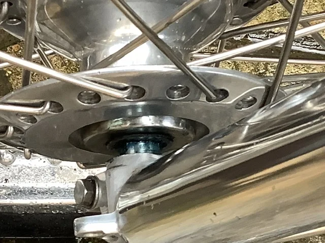 The distance from the rotor to the fork slider is set/dictated by the wider R/H chromed axle cover/spacer and rotor offset given the wheel is pinned to the right hand fork. (Maybe 2 mm with a stock OEM rotor to the slider)