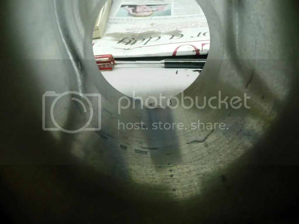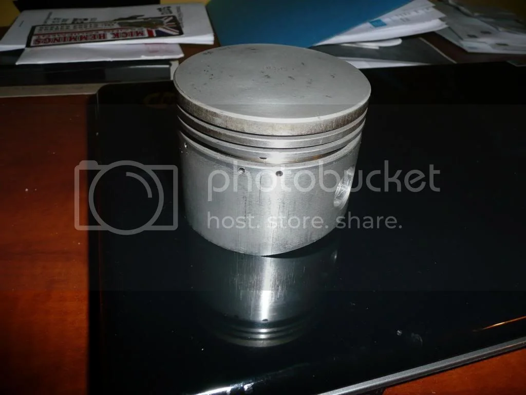 Good day Gents, My 73 850 has +20 Hepolite pistons. I just measured the gap between my piston and cylinder wall, came in at .007. Then I slipped the top ring in and placed it about 2 inches into the barrel from the top and it came in at .016. What should I be looking for if I have the cylinder honed and replace with Andover GPMs ? You can see in the reflection of the picture the lines on the current pistons however the barrels are clean. Would you re-use these pistons with new rings?
