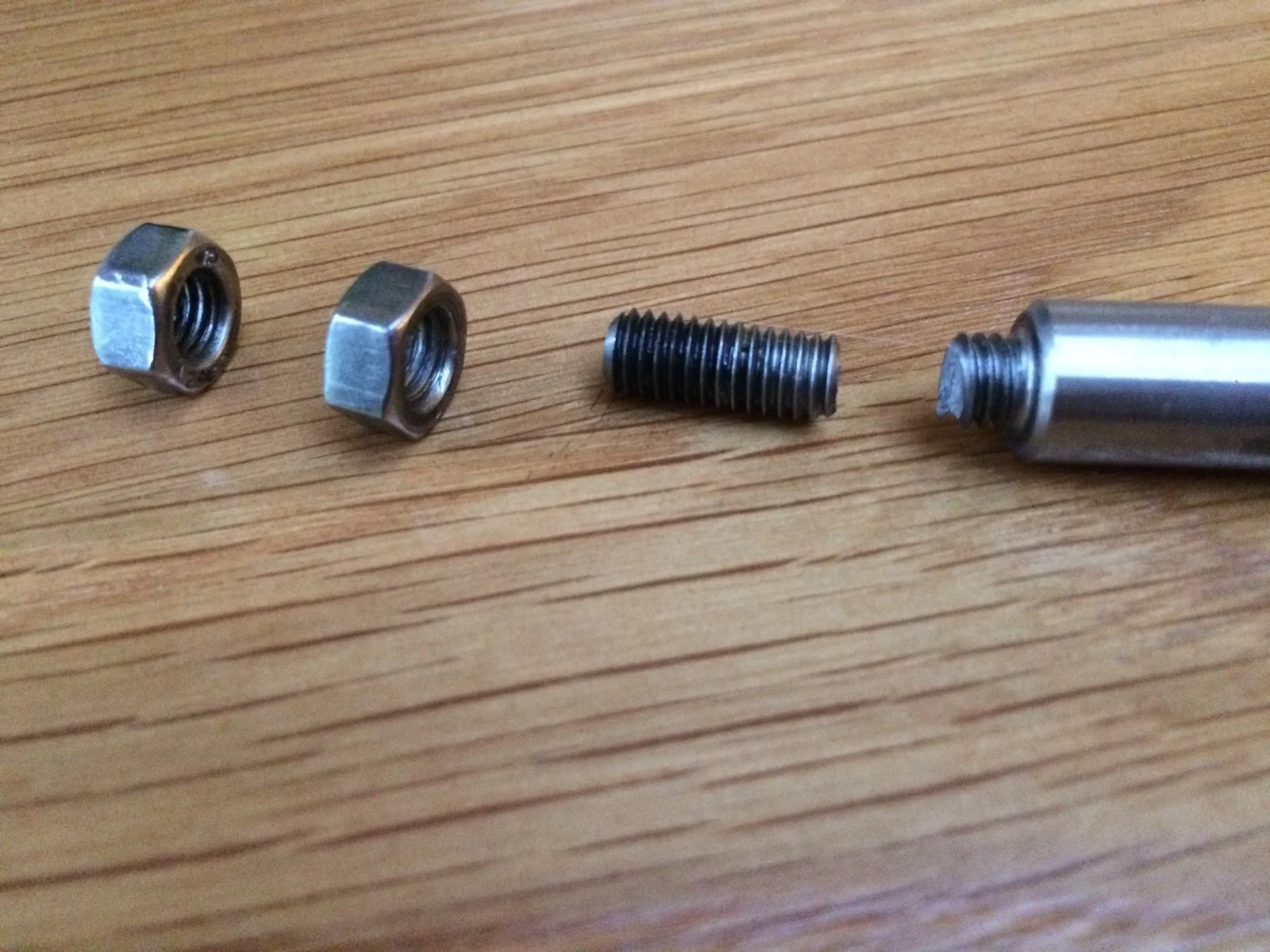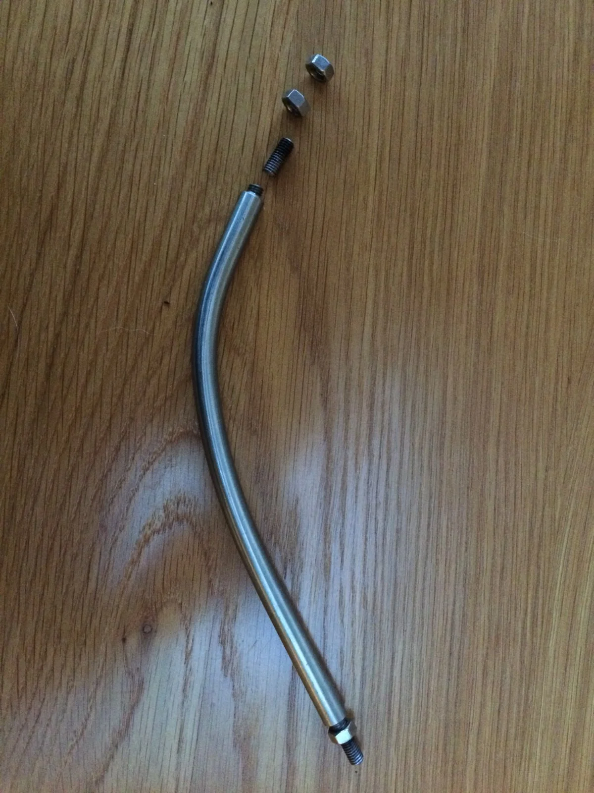 For my final musings on the subject - FYI just to illustrate how strong a high tensile bolt is this is a 4mm bolt carrying my full weight with no deformity. Stainless A2 is obviously the best solution but a bit weaker. So I reckon a new stainless rod, drill it in the lathe, tap it 6mm, bend it how you fancy then A2 S/S stud Loctited in and existing ball joints on. A tad overengineered but easy to make and I guarantee it will not fail.