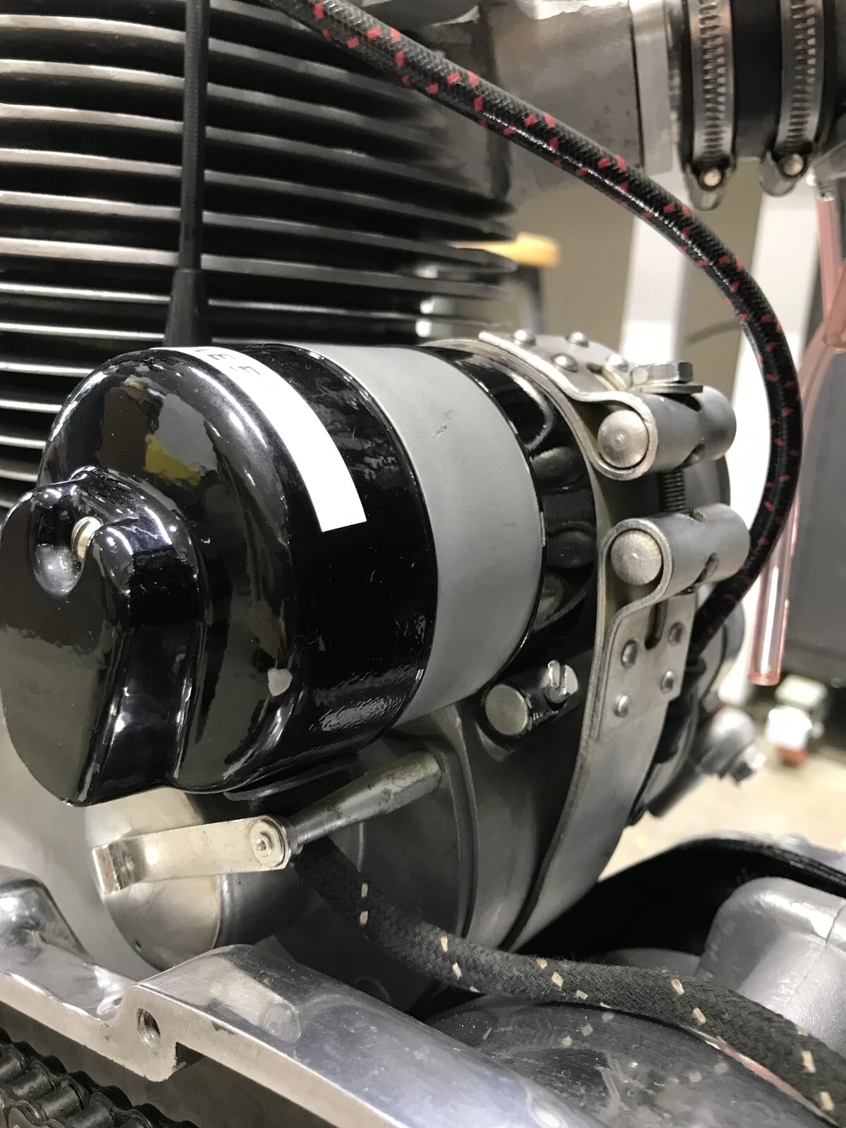 Note the quick release plug in the headlamp. I found out this was available (only?) in 1960 for those who wished to race these machines. It made removing the headlamp quick and easy. A very difficult to find item.