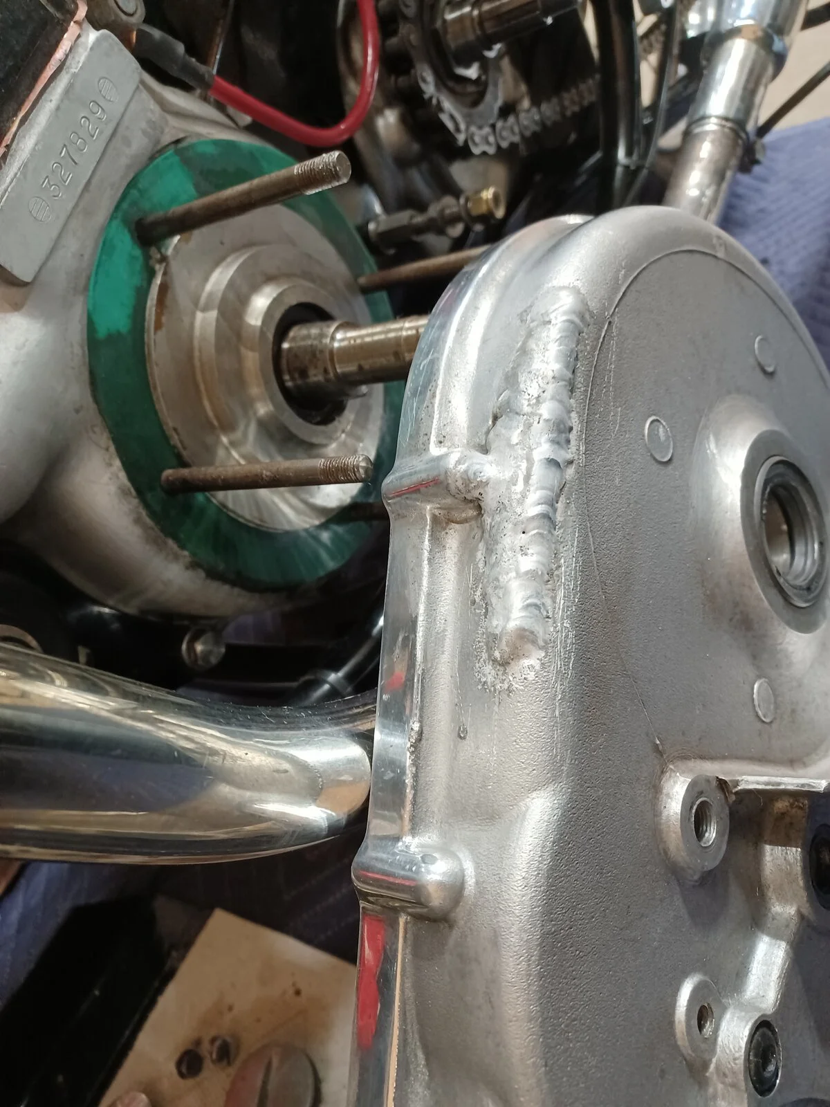 Took my inner chaincase to a local welder and dropped it off for repair. Picked it up today and I think it looks pretty good. It's going back together tomorrow.