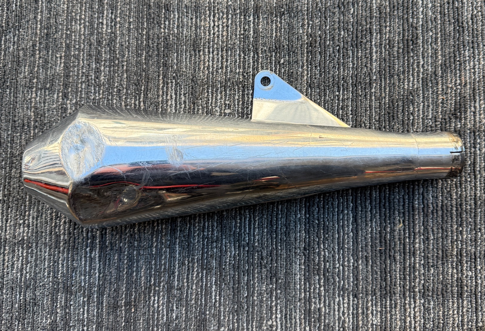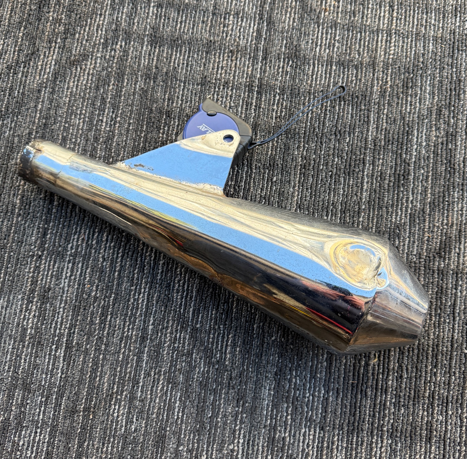 Or, buy a chrome universal muff, take it to the same fab shop, have them carefully cut the welds on that bracket, TIG it on to the new muff, mask off the very small heat affected areas around the welds, touch up with silver paint.