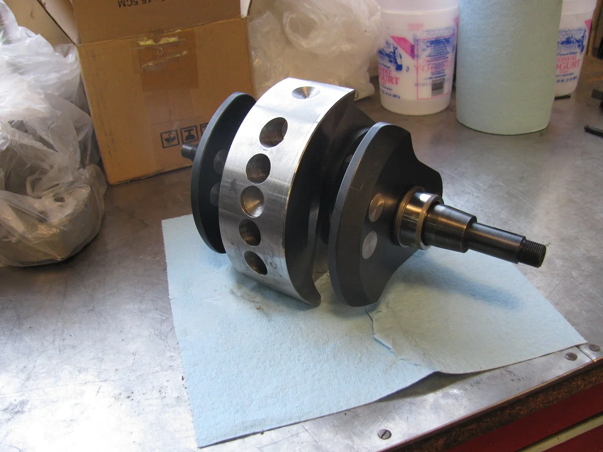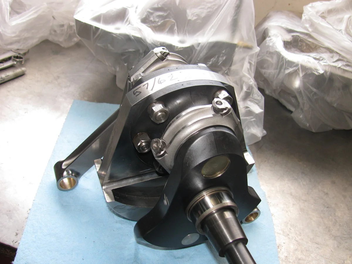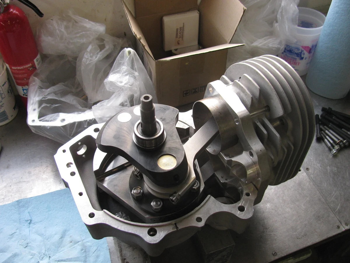 So, next step is partially assembling to check for rod bolt clearance in the crankcase. I expected maybe a little interference, requiring some slight grinding for clearance, because of the long stroke. This is a shot of the assembly. There is a piston on the left rod to guide the rod appropriately. I'll eventually do the same with the left side crankcase half, with a piston on the right side rod.