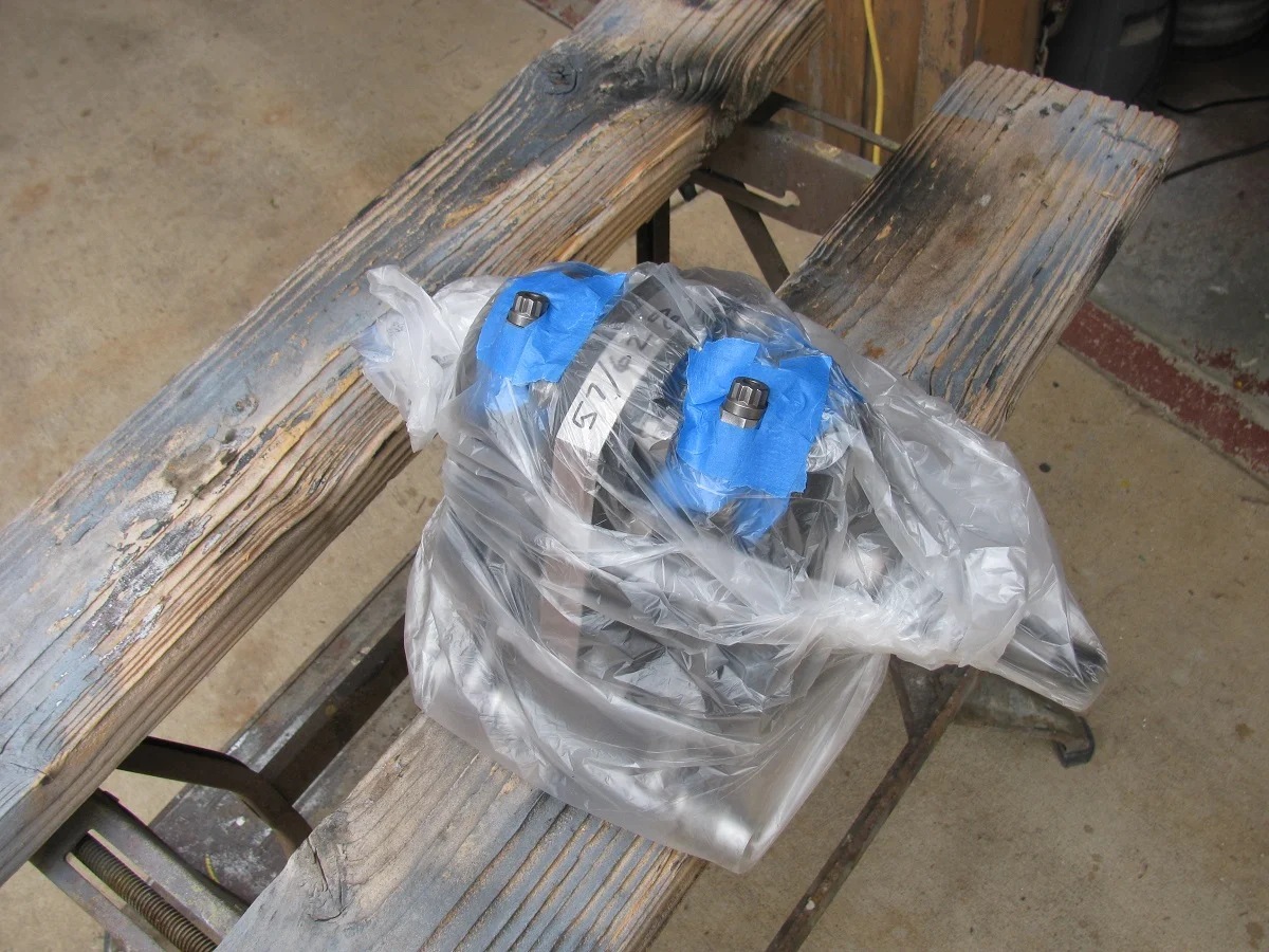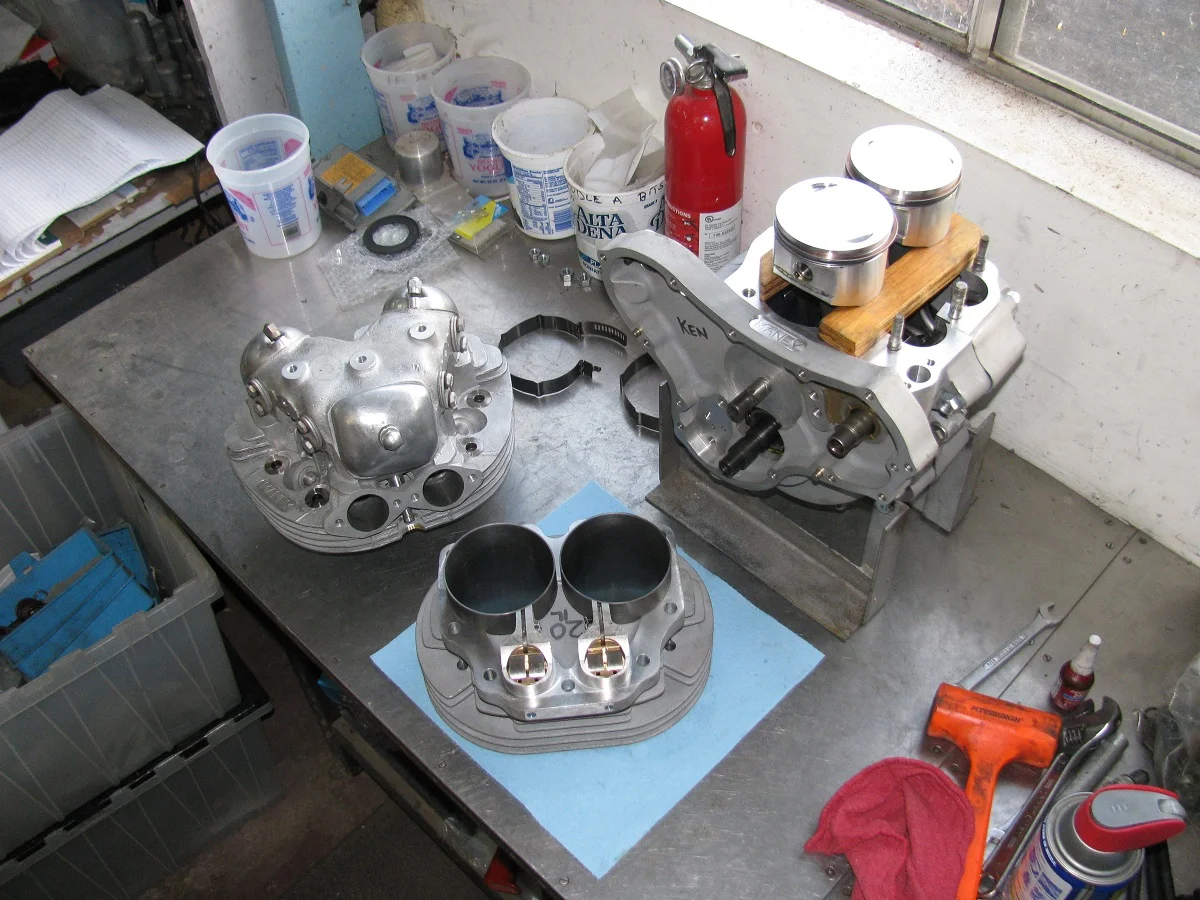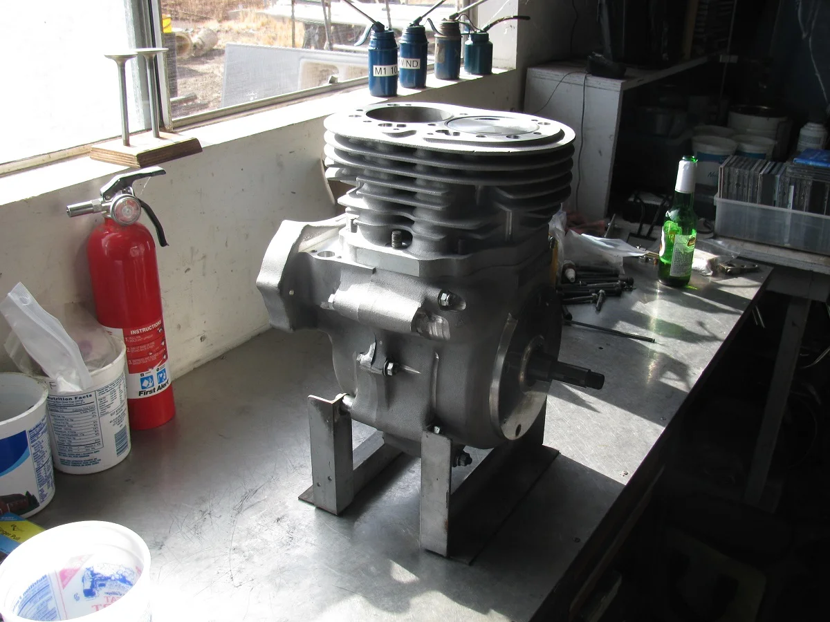 So, next step is partially assembling to check for rod bolt clearance in the crankcase. I expected maybe a little interference, requiring some slight grinding for clearance, because of the long stroke. This is a shot of the assembly. There is a piston on the left rod to guide the rod appropriately. I'll eventually do the same with the left side crankcase half, with a piston on the right side rod.
