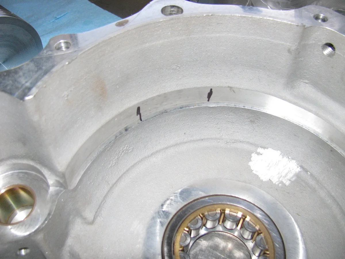 This shot shows the area (between the marks) at the front of the case that needs metal removed to clear the rods. There's a similar area at the rear.