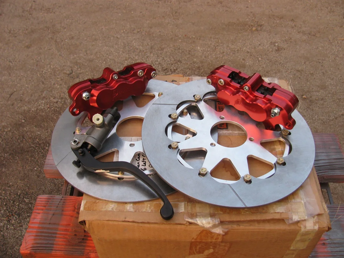 I already have a rear disk and TZ caliper that fit the rear wheel with my swing arm, but they're still tucked away somewhere. This picture of the PR shows the rear brake I'm planning to use.