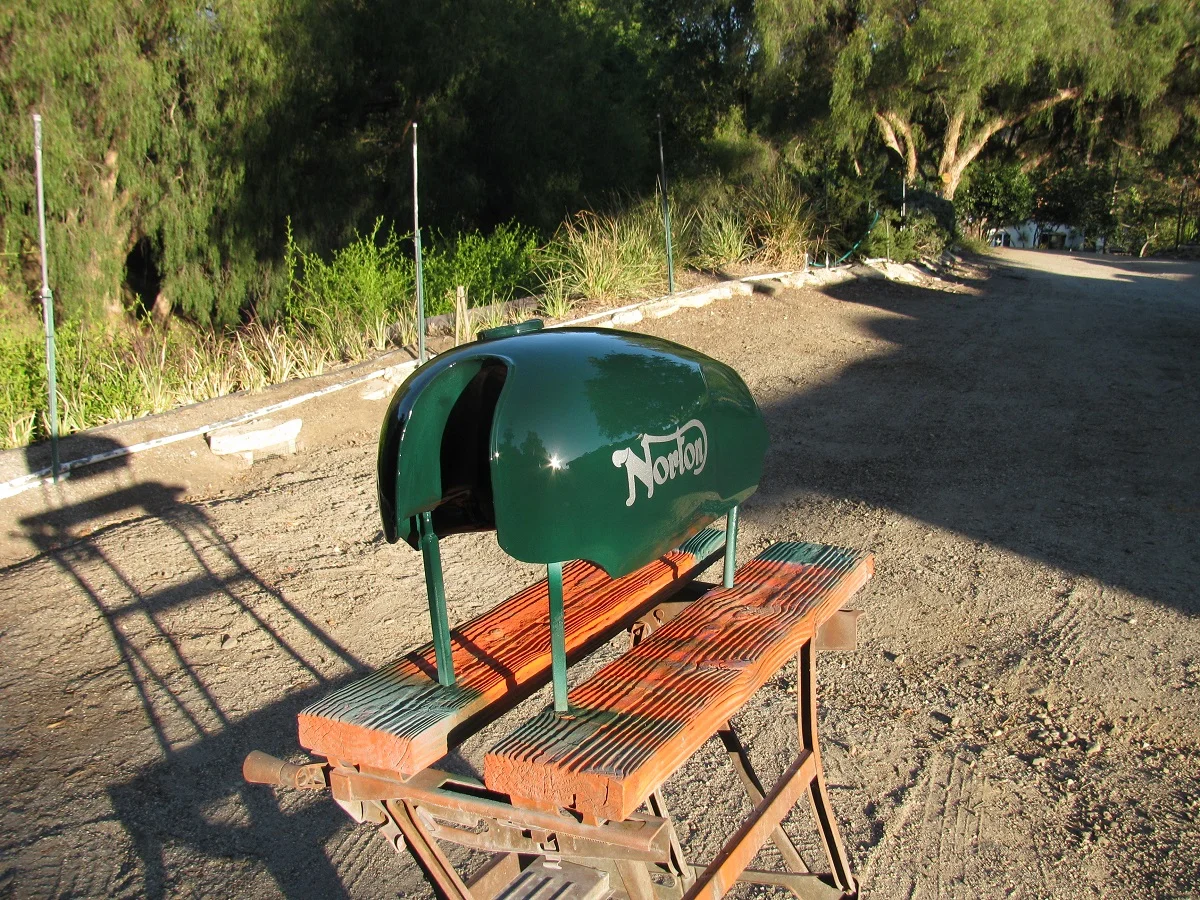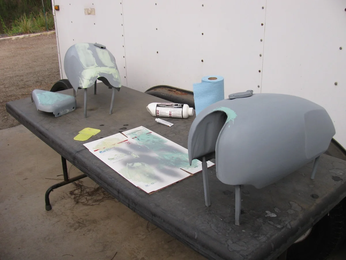This is a shot of the tanks and one of the side covers after sanding and touching up with polyester glazing putty. There were some areas at the front of the tanks that needed some rough welds and grinding marks filled in, and one of the tanks had some rough grinding at the rear. They really aren't bad, and some of them would have gone away with some more primer surfacer and sanding, but this way I can probably get away with only one more round of surfacer and sanding to get them ready for paint. This particular side cover was rescued in pretty bad condition, so is taking more effort than the others, which are ready for paint. I'm just happy to be making progress. I'm only an amateur painter, so everything takes way longer than it would for a pro, but it's really satisfying when it's finished.