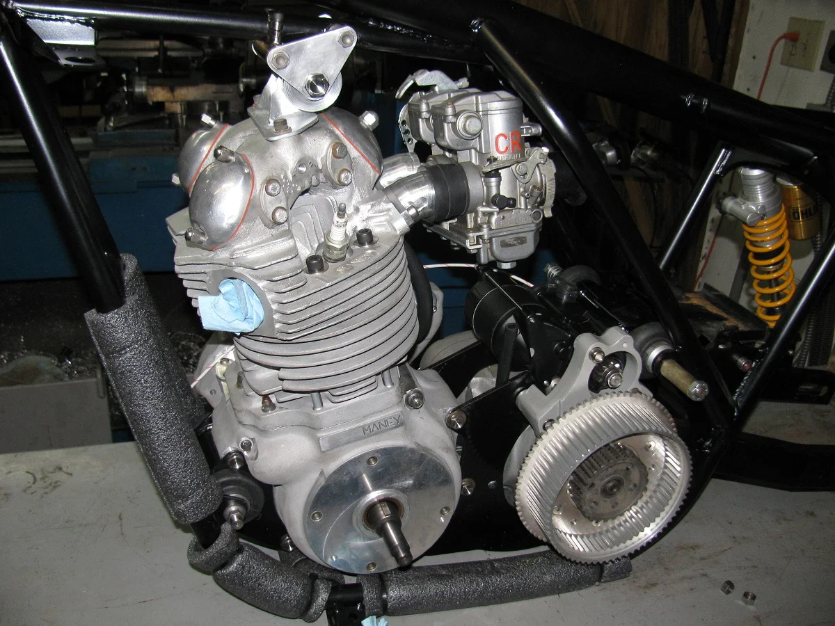 On the carb selection front, I've had a bit of a setback. I was planning to use a pair of Keihin CRS carbs in 37 mm size, which I have left over from the single racing days, but they aren't going to fit. I'm using a pair of Steve Maney's CNC machined manifolds that are matched to the heads, and they are too long for the CRS carbs. I could relocate the throttle drum to clear the tank, but the carbs still interfere with the gusset at the top of the frame. I could make them fit if I made some shorter manifolds, but I don't want to do that. It would be hard to match new manifolds to the head with the bike in the frame, and I don't want to pull it out again. I have a set of 36 mm Amals that I could fit, but I really like the light throttle pull on the Japanese push-pull carbs. Before anyone jumps on me for not being manly enough to handle a stiff throttle, let me pre-empt them by explaining that I've had surgery on both hands and only have about 60% normal strength in them, and at 74 years of age, I now get to add arthritis to my blessings. A light throttle pull is pretty much essential if I want to ride more than a few miles without cramps.