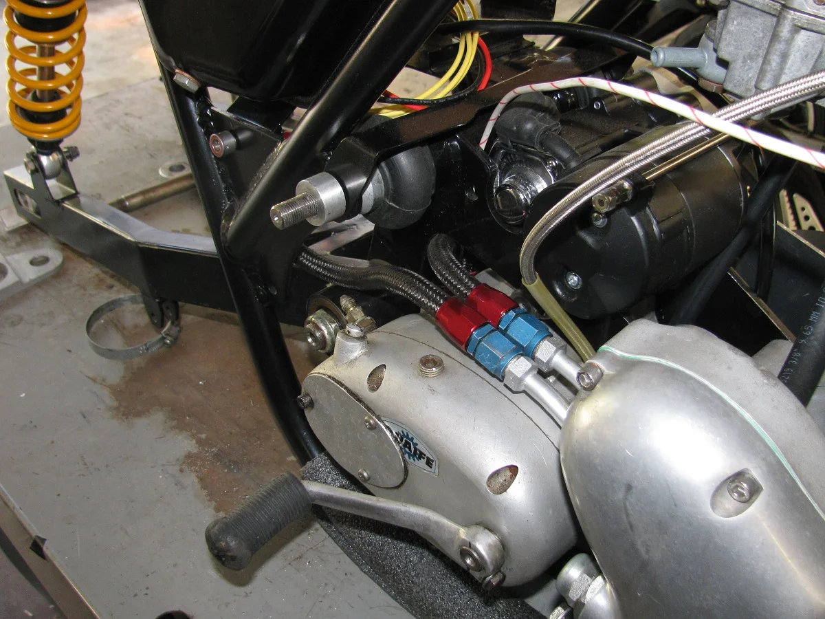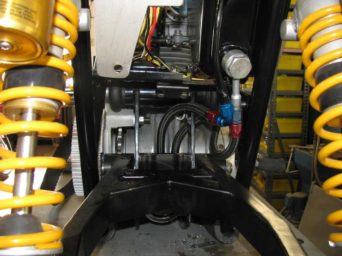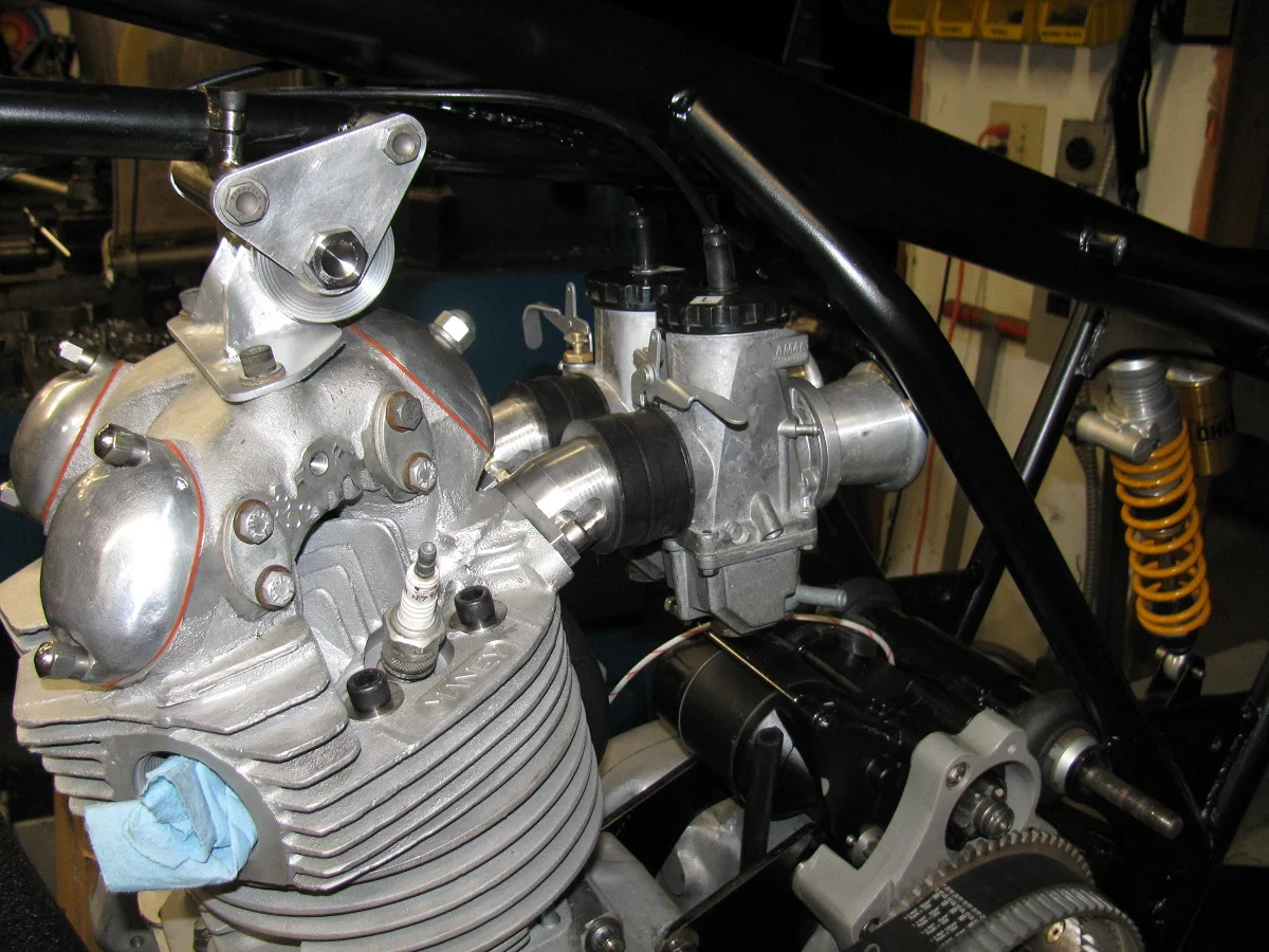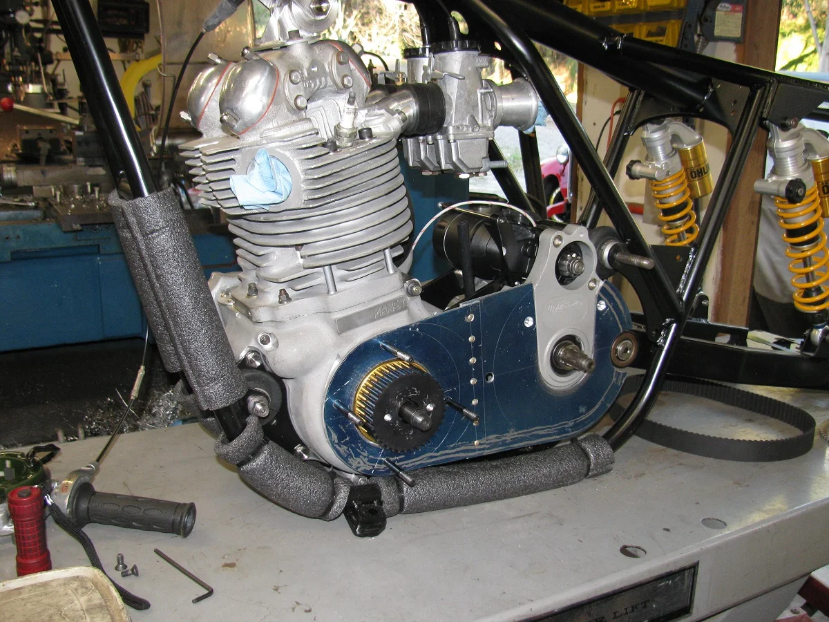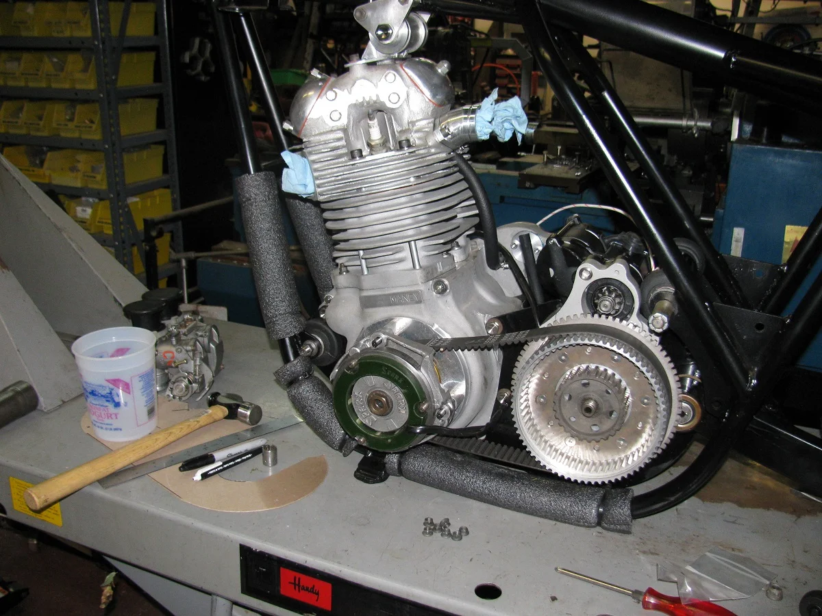 A little more progress. This is the primary drive and starter system mocked up in final form. I did have to make some changes. Originally, I moved the gearbox over .250" to the left, as I had done on my race bike back in the day. Turns out that isn't going to work here. The ring gear on the clutch basket takes up some of the space on the belt pulley part of the clutch, so I can only move the gearbox over by .125", unless I want to move the engine pulley outboard by another .125"+. I don't want to do that, because that would also mean moving the alternator rotor out that much, making a new rotor nut in the process, and reducing the amount of shaft support for the rotor. It's not that it's impossible, but it doesn't seem like a good plan to me. The extra .125" will give me enough chain clearance for any tire I might want to run on the rear wheel I'm using. I originally moved the gearbox over to allow a wider rear tire, and in the beginning I was planning to have enough room for a modern 17" rear tire, just in case I chose to do that in the future. Giving that option up doesn't bother me much. I still need to keep it at least .125" offset so the clutch basket will clear my wider swingarm at the pivot.