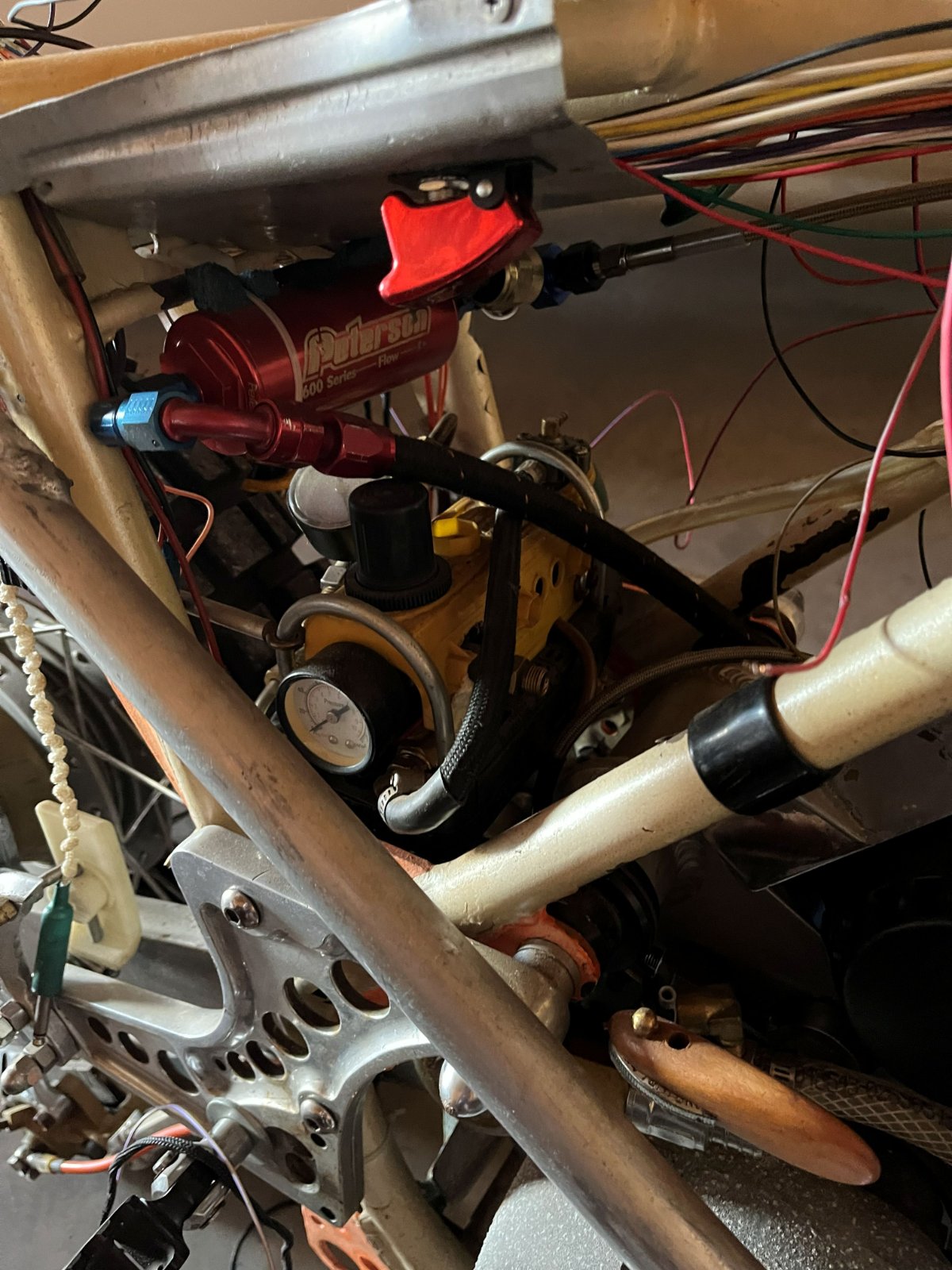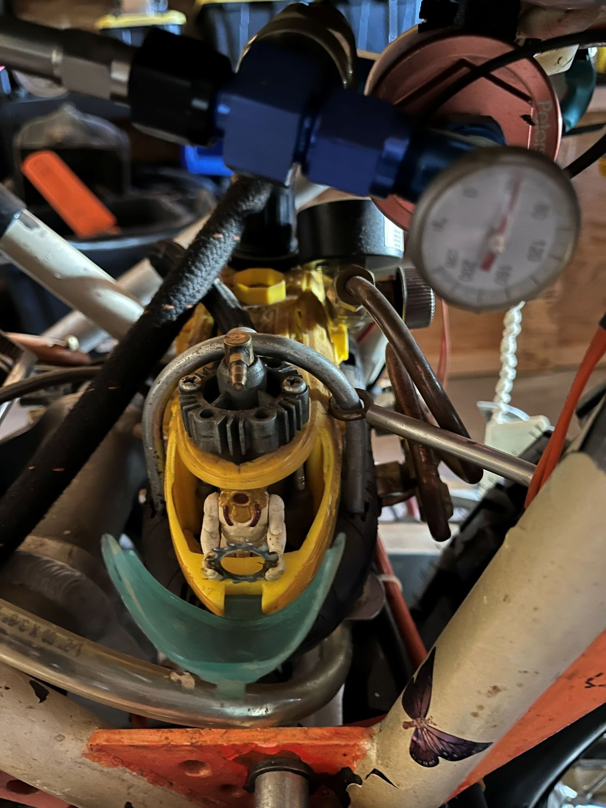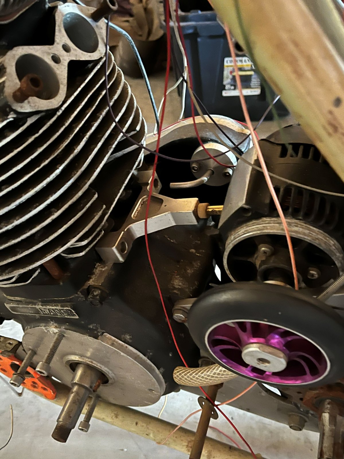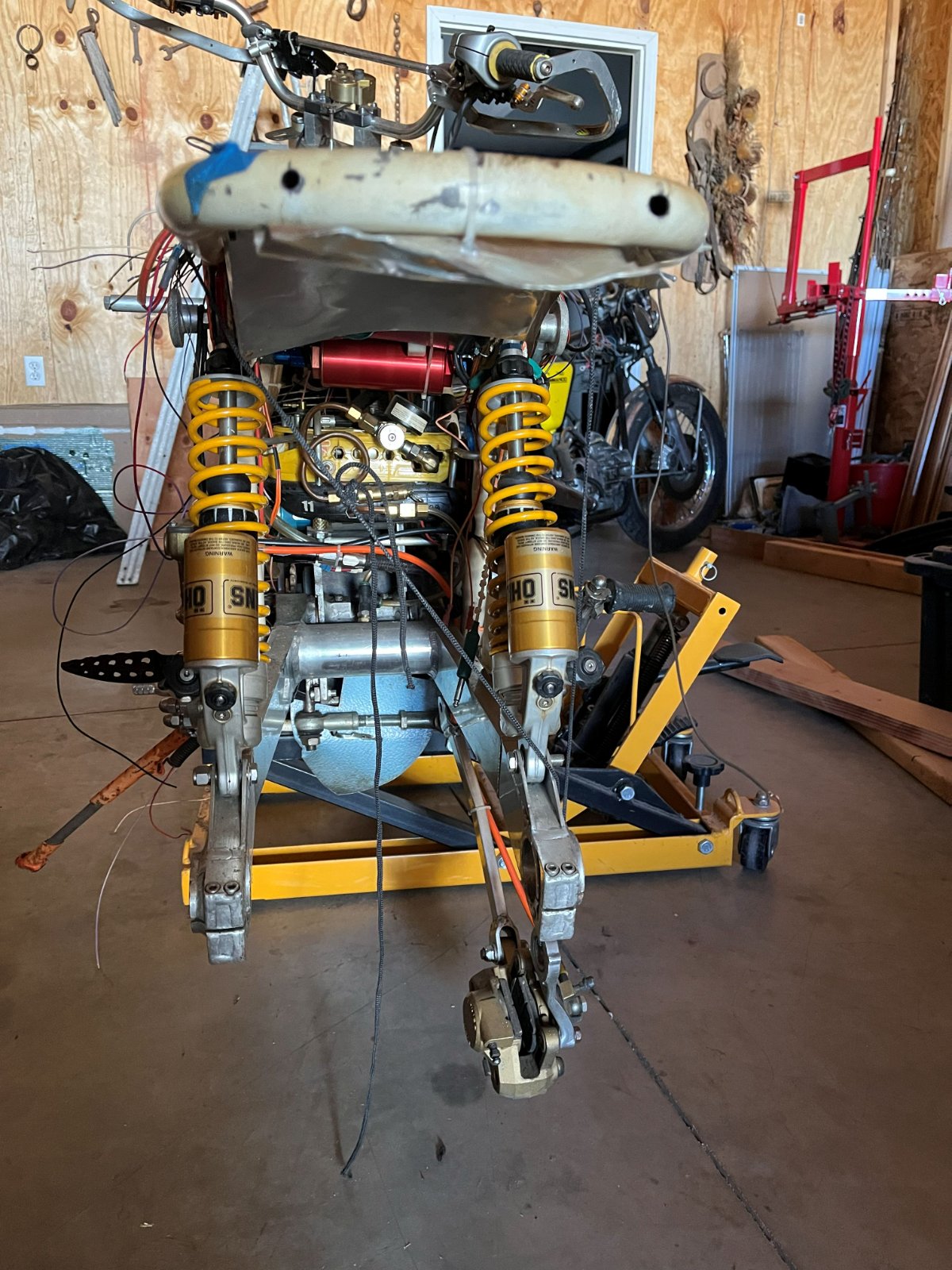The first picture is with the submarine window open, second picture is a motor that must weigh 10 lbs. that's not connected to anything. Third picture is an oil filter I think, and last one of the bent swingarm and the shocks. There are also other things I will leave off, wow he had an interesting imagination. The paperwork that came with it is amazing, I think he must have kept everything. One thing I saw was he had a Mega Cycle with a Norris D+ grind put in it, don't think that was such a good thing. LOL