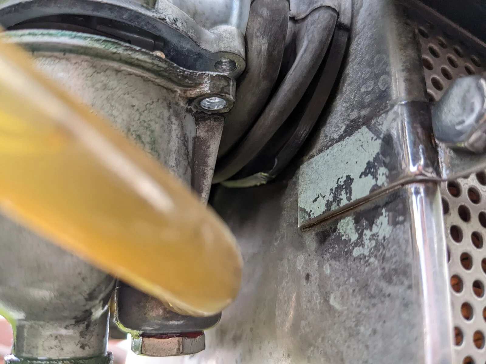 Here's a new one (I think). I'm riding along and start to lose some power. Have to keep the rpms high. Still enjoying the ride and figure I'll just turn around and head home. I do a u turn and start dumping gas. A closer look and the two screws that hold the bottom of my Amal carburetor in place must have fallen out. I haven't touched them in over a year..