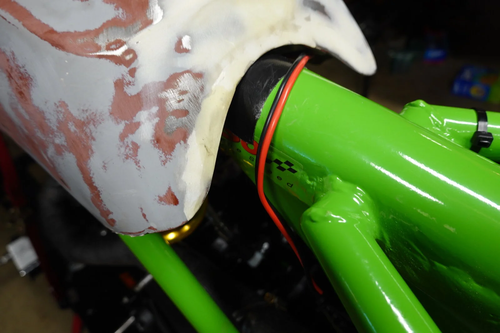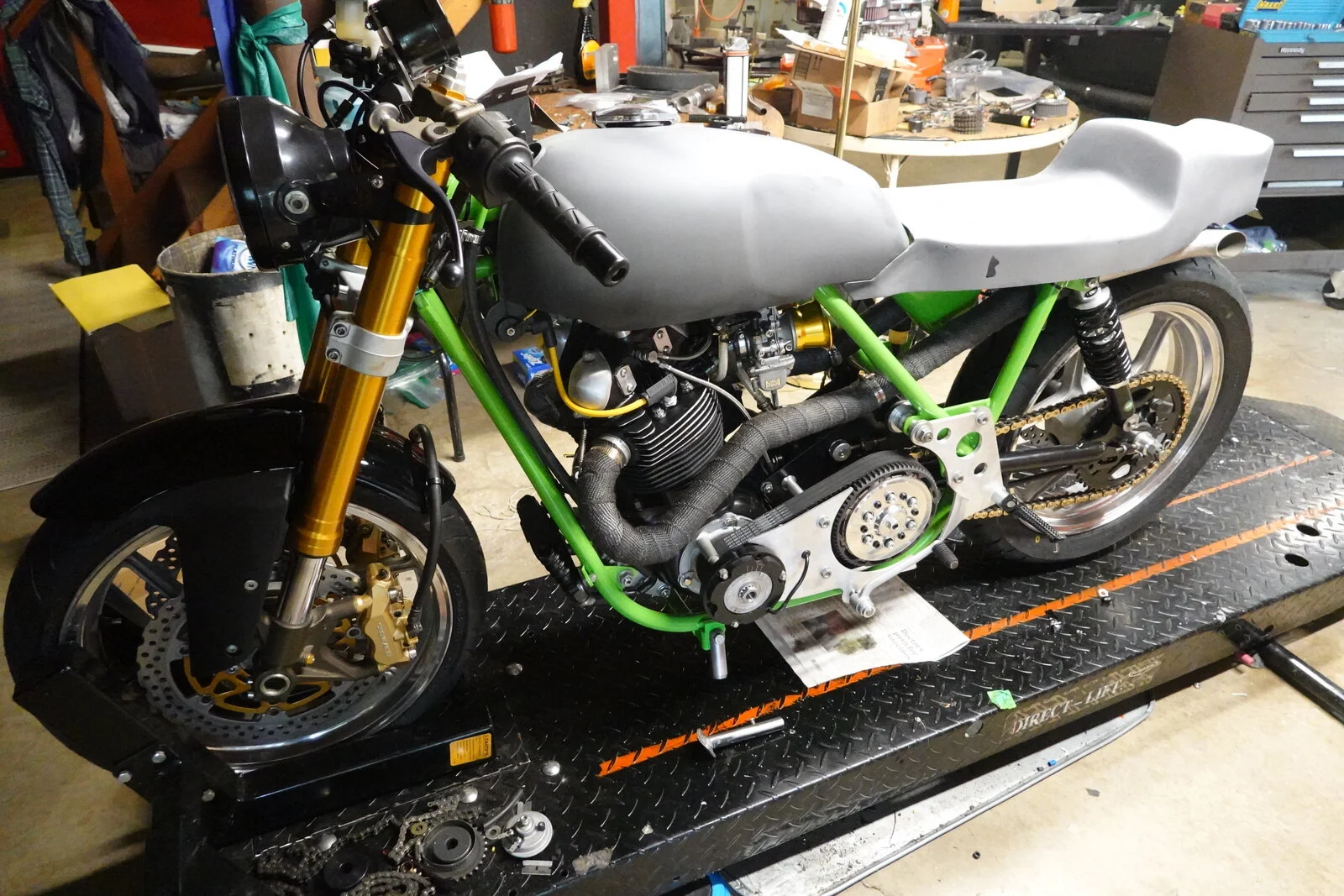 Dropped the needles the two notches and set timing, it was not advanced enough. Down the road, bottom and mid range great, top end I thing rich. But a real problem is getting it to shift. Without my modifications trans it seems a little snug. Down shifting isn't a problem but up shifting is a" when it wants to" situation. It had been rebuilt by PO. Engine a little noisier then I like when hot, I think it's the short pistons, not really a knock, again with velocity stacks everything is exaggerated. Might be the gas tank jumping around, I want to run it a bit and see where it is rubbing before I finish paint it. Seat height is 27 inches without 1 inch foam. Handling is GREAT! Doesn't want to fall over at slow speeds and follows a line in the small curves of my neighborhood. Hope I didn't use up all my luck on this build! LOL