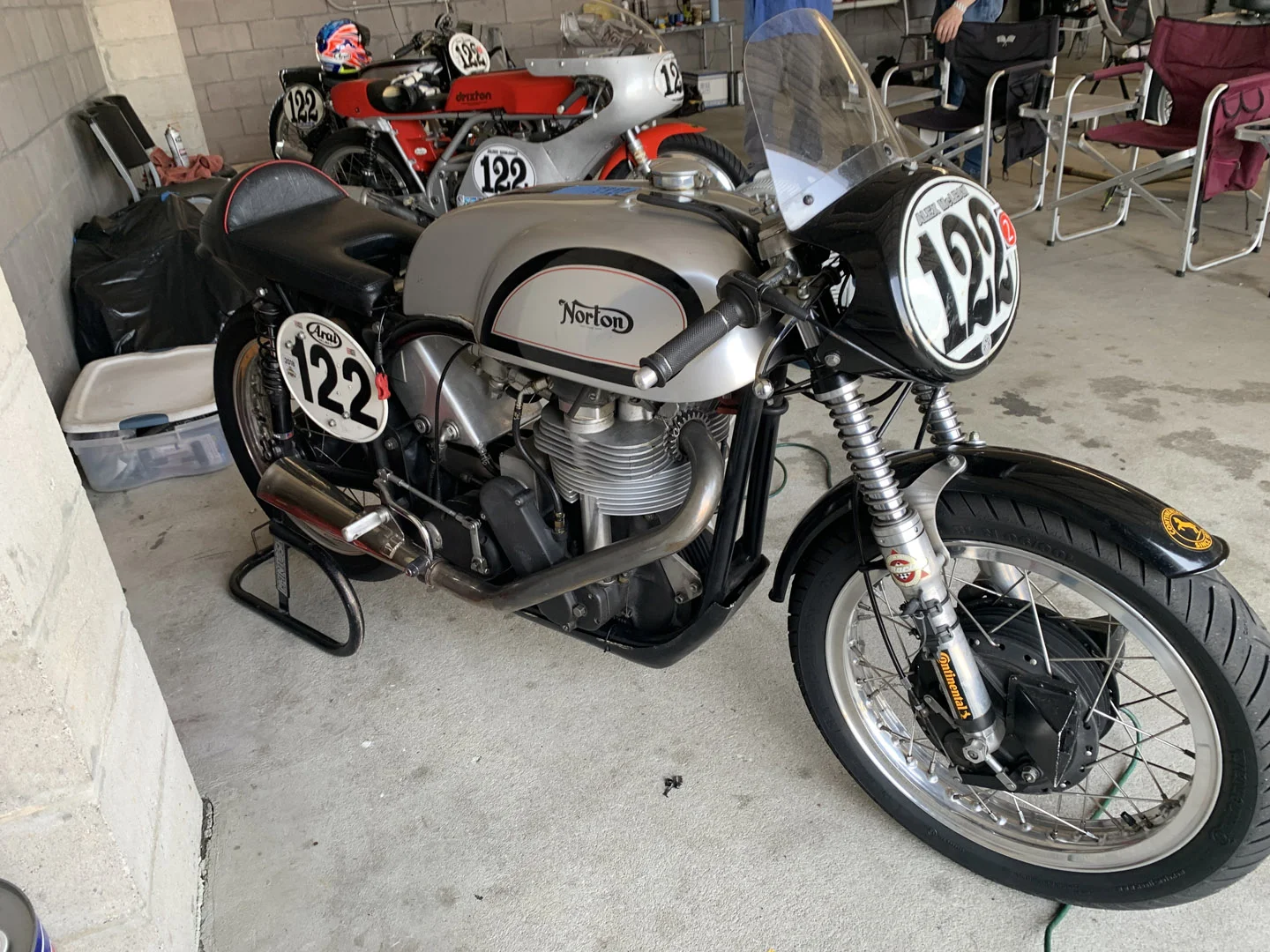 Low and behold, i ran into the legend Kenny Cummings, owner of NYC Norton. I've bought some of his parts (swingarm clamp), but never personally dealt with him. He was totally approachable and kind enough to let me borrow his exhaust spanner. And that wasn't all, he took the time to safety wire the exhaust nut. Respect right there!