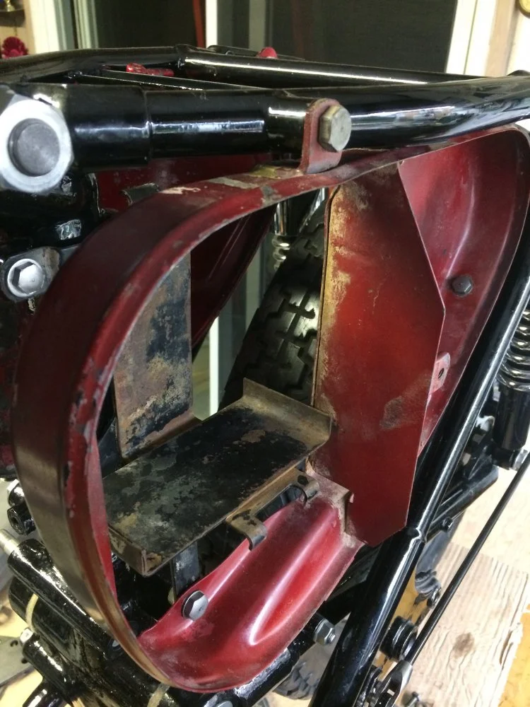 I am restoring a 1965 N15 that has been without its tool box etc. for I assume many years. I found the correct tool box for a 1965 (they can be different by year) but some idiot removed the frame mounting tabs. Can someone show me pictures of exact location and the size of these mounting tabs. You must have a 1965 to help me. Any actual dimensions would help as well. The people in the local Norton Club have 1967s which mount very differently. Thanks everyone!