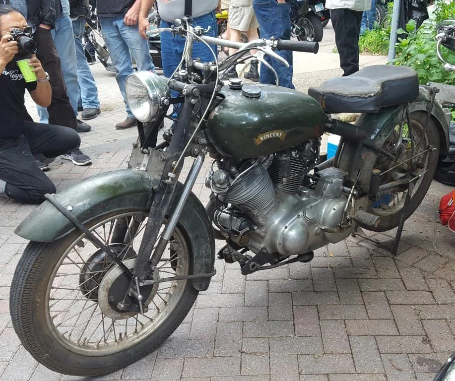 Another Vincent resurrection sees the light of day and once again breathes fresh air. Steve Hamel recently (2 weeks ago) purchased a 1952 Vincent Rapide Touring basket case that was disassembled circa 1961 after a big end failure. He set-out the goal of building the bike up from bare cases in 2 weeks and riding it to the Blind Lizards Motorcycle Club Rally in MPLS MN today. Well, after rebuilding many assemblies (crank, heads, tranny, primary, etc) and putting the bits back together he made it and here are a few pictures of the gem from this morning.
