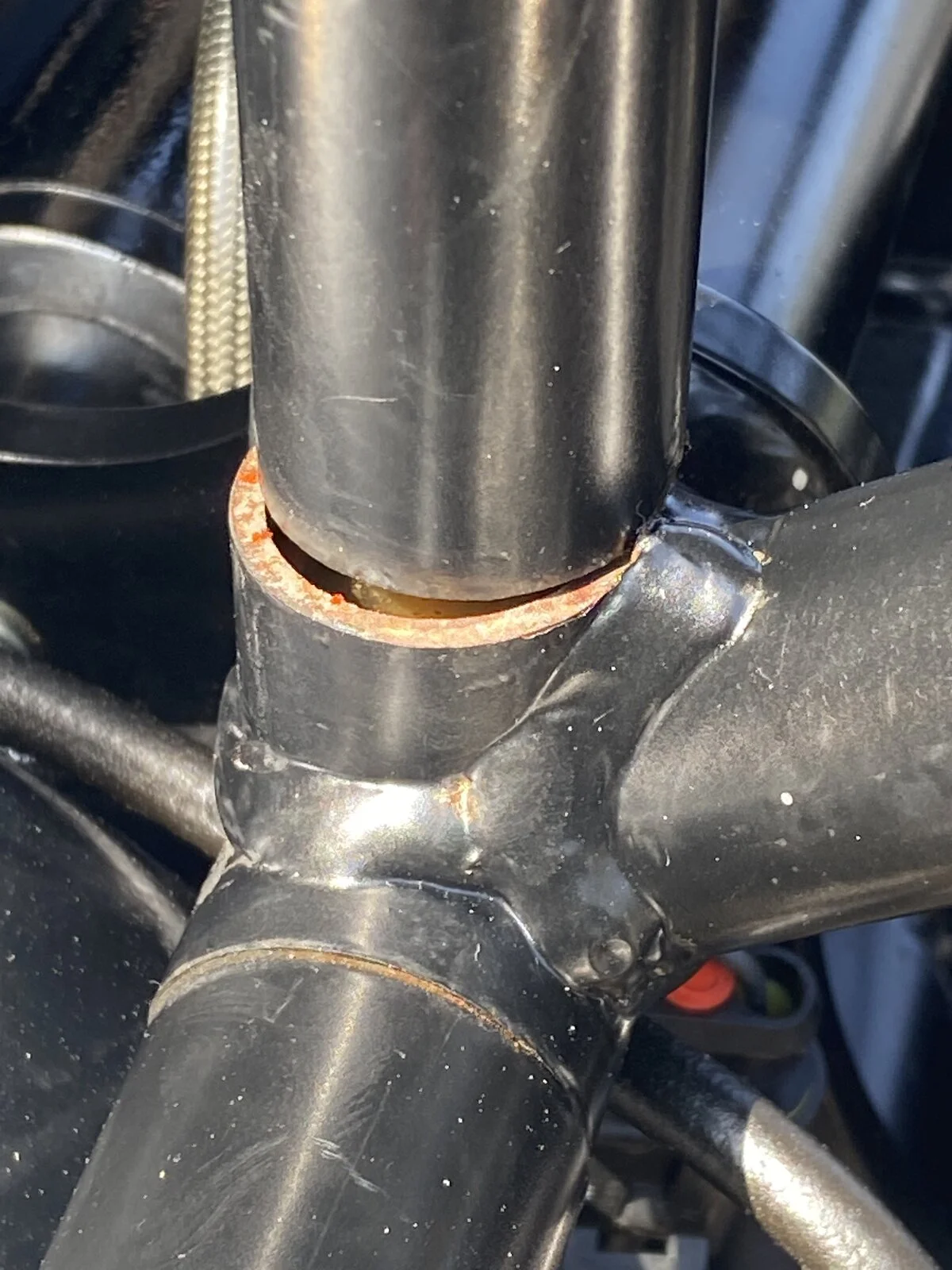 Most likely it started as a hairline crack at the weld stress point and worked its way around .I did 160 miles last Sunday on it and it obviously happened then Not sure what strain this has put on the rest of the frame