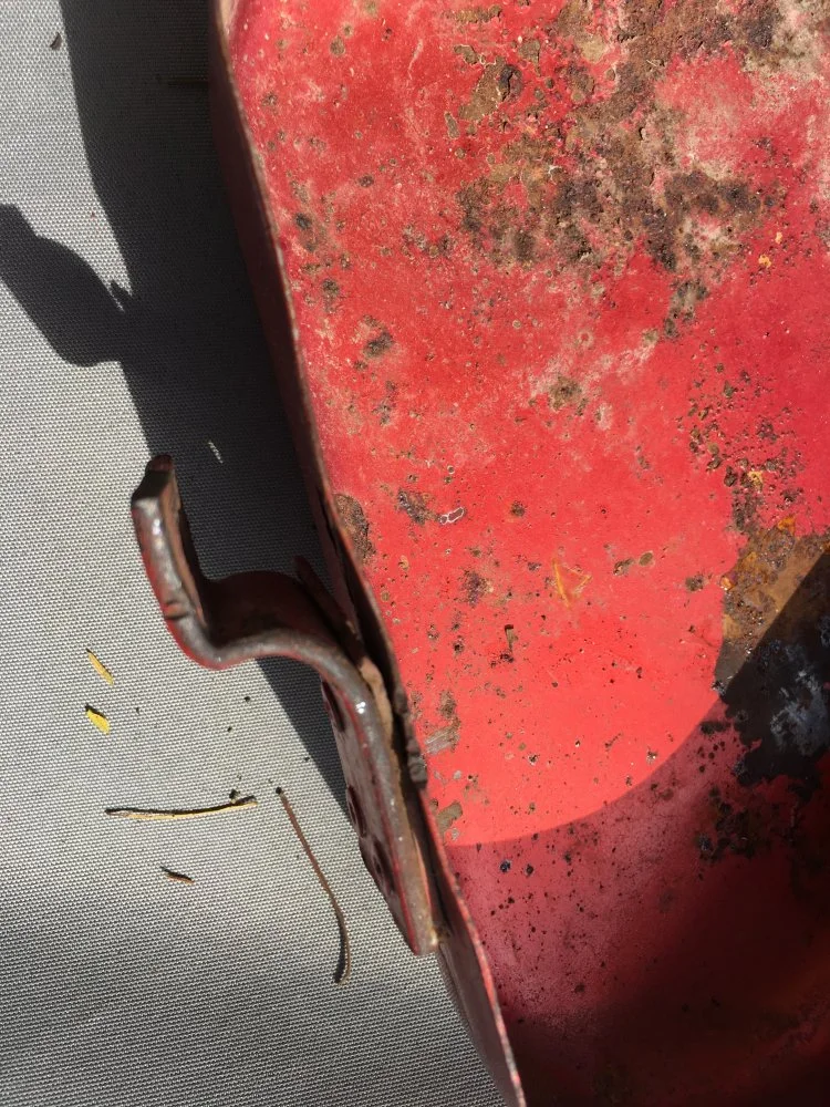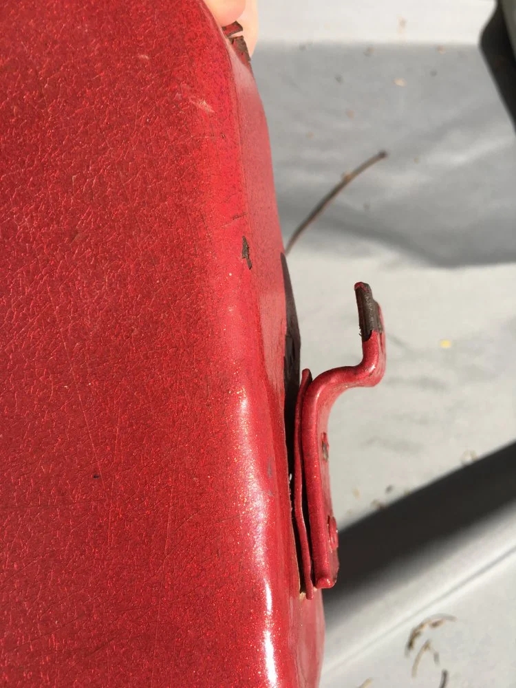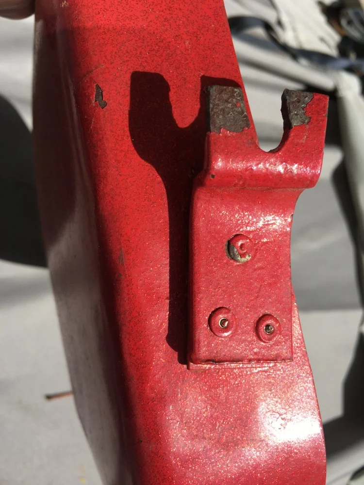 Front bracket should be spot welded, not pop-rivet and no 'spacer' between the bracket and cover. There is a reinforcing plate on the inside of my Ranger 750. Both the top and rear mount holes on my Ranger 750 cover have thin 'sheetmetal' washers tacked to the inside. I assume this cover is an original. My '67 cover is a reproduction and had to be drilled, but I tacked a thin washer to inside of the top mounting hole and added a piece of reinforcing 20 gauge sheetmetal on the front inside where the fixing bracket is spot welded.