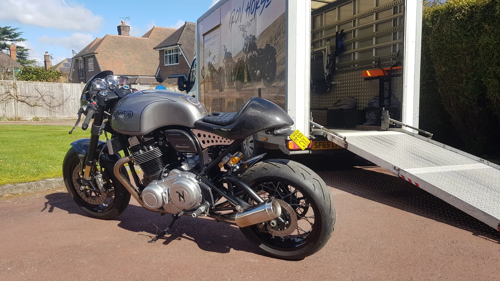 So here it is being delivered today! It's a very pretty bike, but I'm already getting the 'Norton' experience and I've found some interesting issues that will need to be resolved already...havn't even had it a day yet!