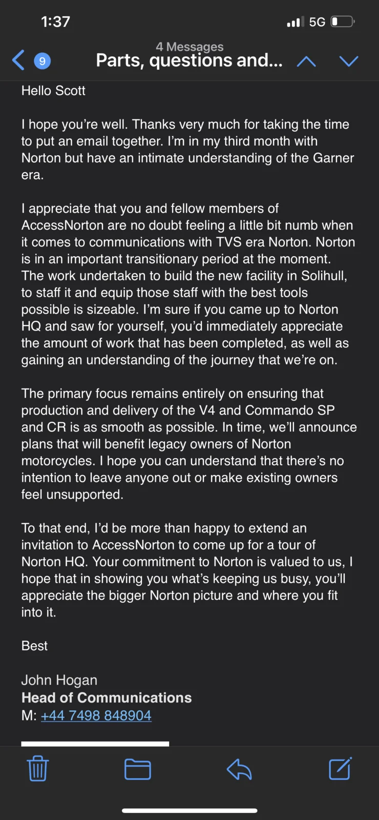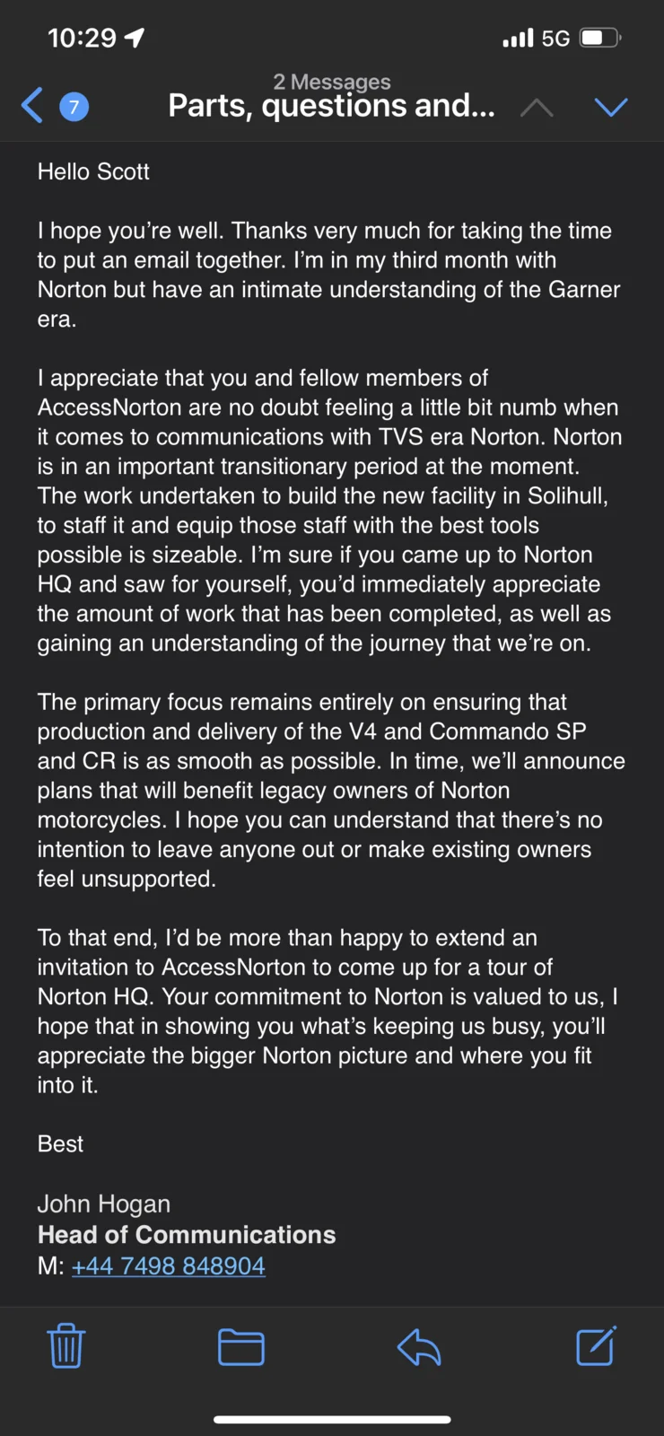 I do not believe that Norton Birmingham are purposefully trying to exclude or disadvantage legacy owners. Why would they, that would clearly be to their detriment in the long run. Hence (maybe), the invitation for Access Norton to visit and reference to ‘in time we’ll announce plans that benefit legacy owners’. I know that we are a loose conglomerate of ageing enthusiasts on a forum, but it may be beneficial if a UK member (or several) wanted to attend the factory. It might demonstrate that we are not just lone voices in the internet wilderness. My thoughts only.