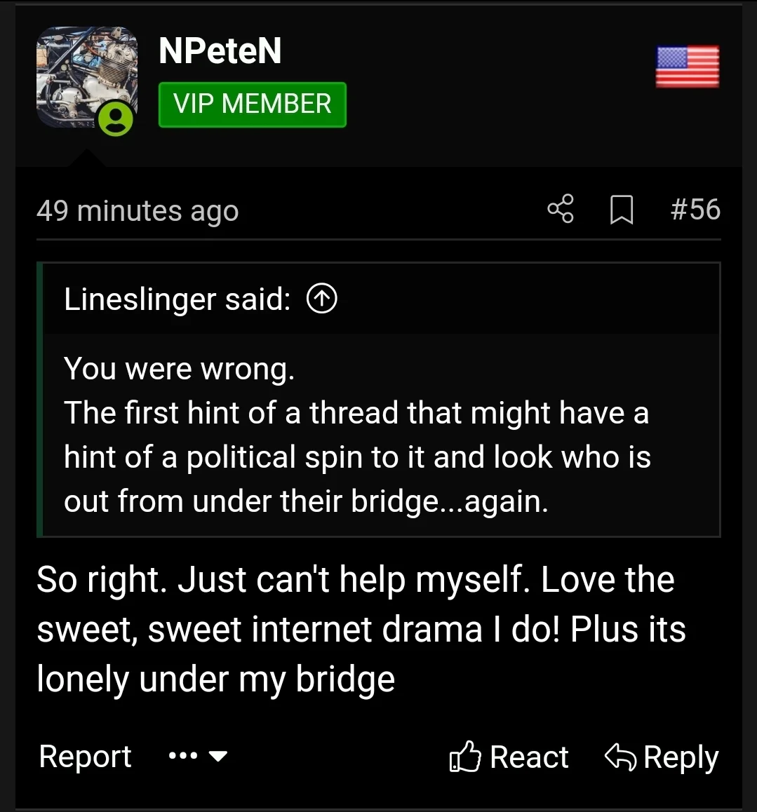 I swear some of you need to go outside, get laid, ride your motorcycle.