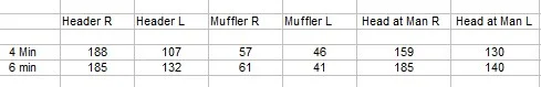 Thanks for the suggestions. I don't know how to measure the intake/flow/volume, but I did get some temperatures, see below.I am of the opinion your cylinders, one for sure, are not breathing properly.