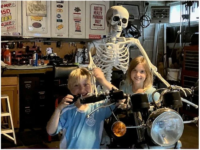 The 2nd photo is a shot of the skeleton they talked me into buying for Halloween. They then put it together, let themselves into the shop and rigged it up on my bike.