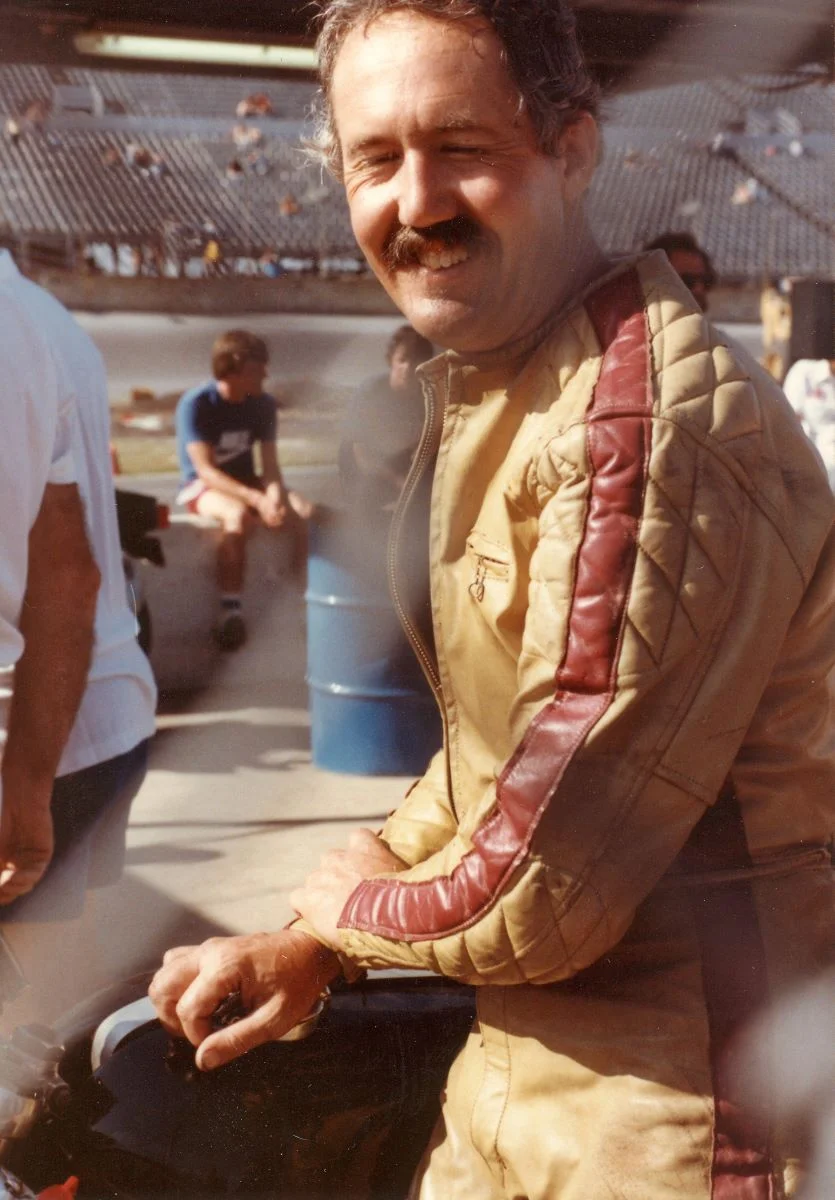 Nice. Gotta be some good off track memories too! Thanks for digging this up and sharing.Me at 42 years of age, at Daytona in 1984, in my first racing leathers. Note the high quality quilted horsehair padding for safety. I had them custom made for me when I started racing in 1972. They were flat track style, but with some mods to make them suitable for road racing. 1984 was the last year for them. The doctors cut them off of me after a serious crash at Willow Springs, also in 1984.