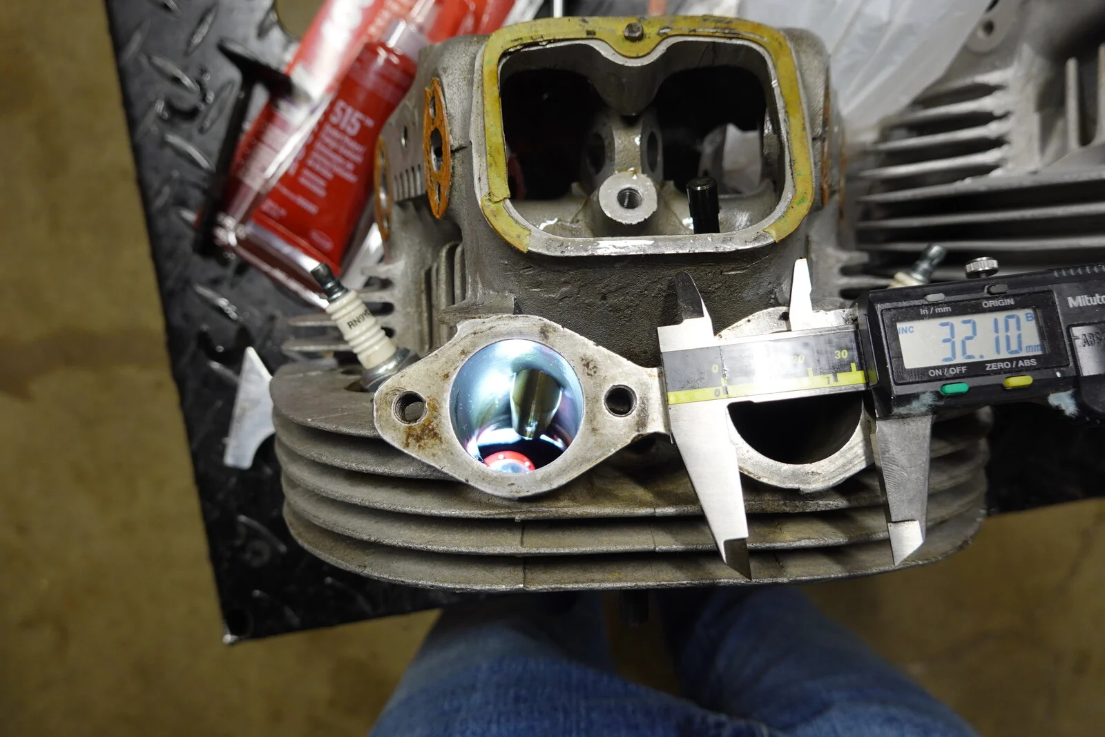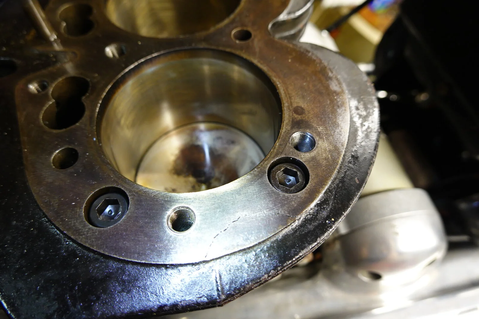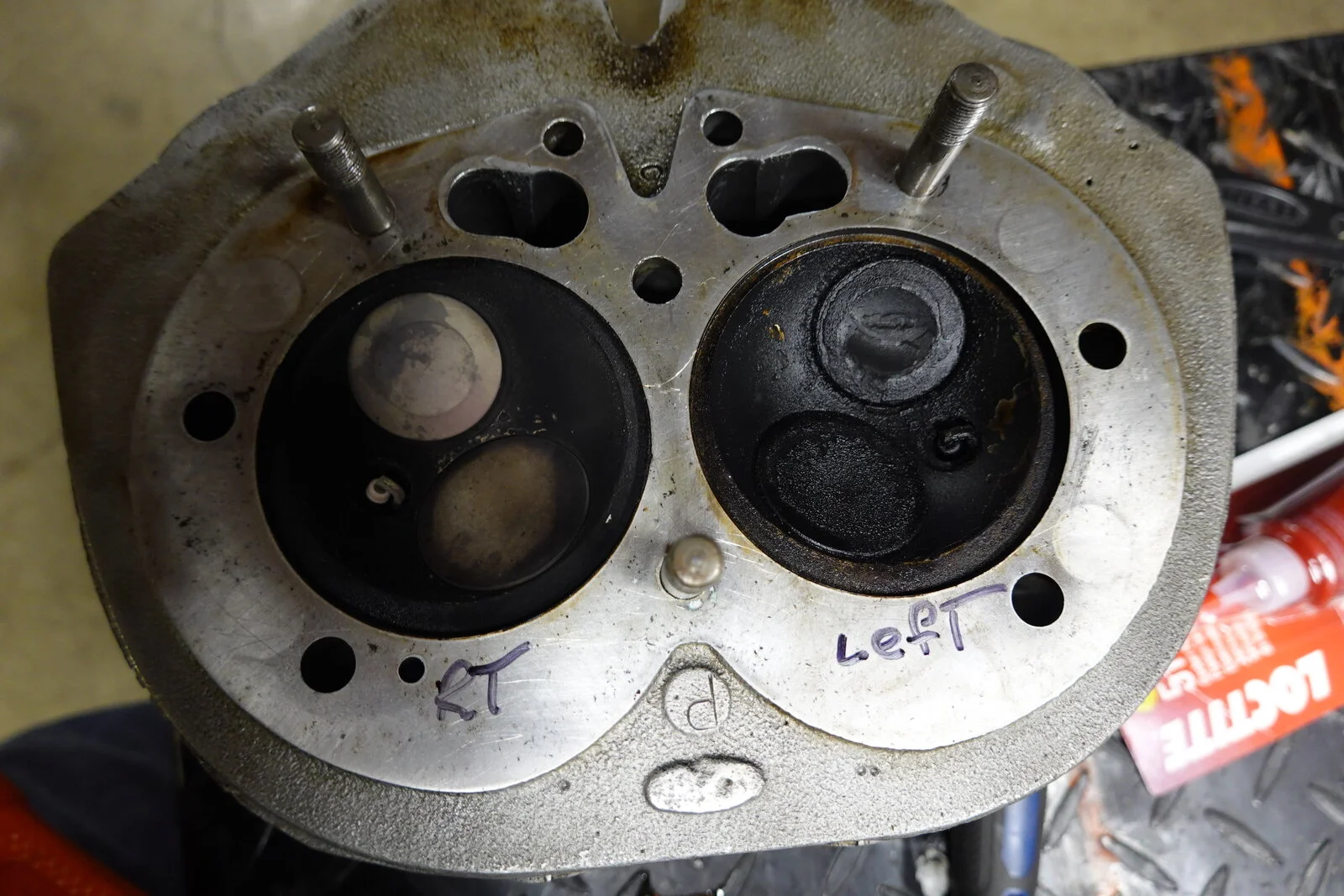 I bought this MK III about 4 years ago with gearbox and wiring problems. It always smoked at start up on left side. If you started it and just backed it out of the garage, shut it off more than a minute or two, and restarted it really smoked! It didn't foul the plug so I put up with it until it started leaking around the push rod area. It misted the left side of the bike if run aggressive. Front center head stud was loose and the small studs were not sealed and one was into the push rod "tube". After disassembly I was surprised that it had a fresh bore .040 over. At this point I should mention that it is a RH 4 head that has been ported. It looks like the left intake seal was moving up and down with the valve. With all the rumors involved with these heads I'm thinking of replacing the left valve guides in case this is also where the oil is seeping from. The valve guide support in the head has been shortened from the porting. See pics, the first head is the ported RH4 and the second is a RH 10 for comparison. I hate to put a good RH 10 on an everyday rider. Trip to the machine shop tomorrow and ask his input and check things for cracks. And yes that is a crack in the barrel. Apparently dropped. I don't see that it will be a problem.