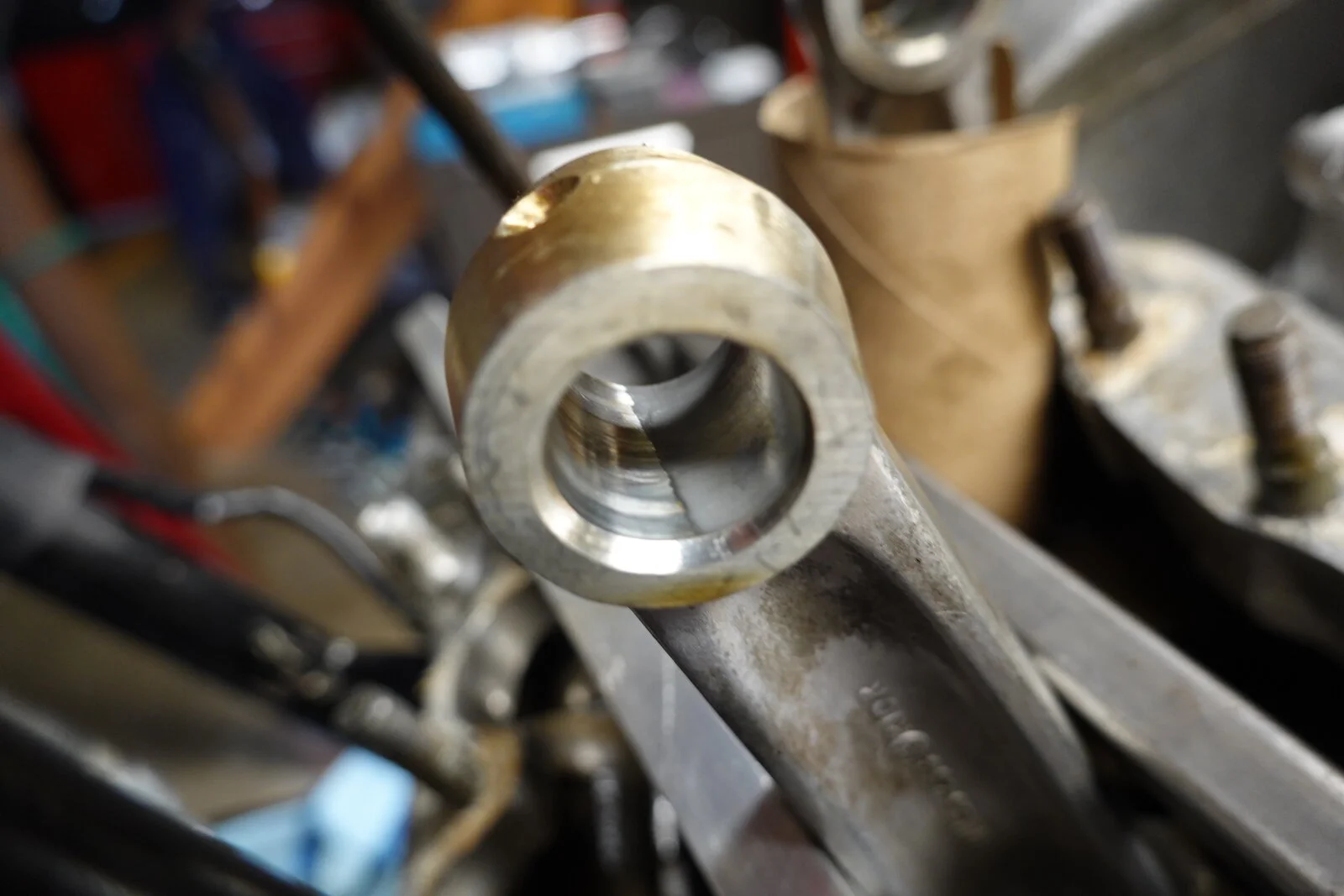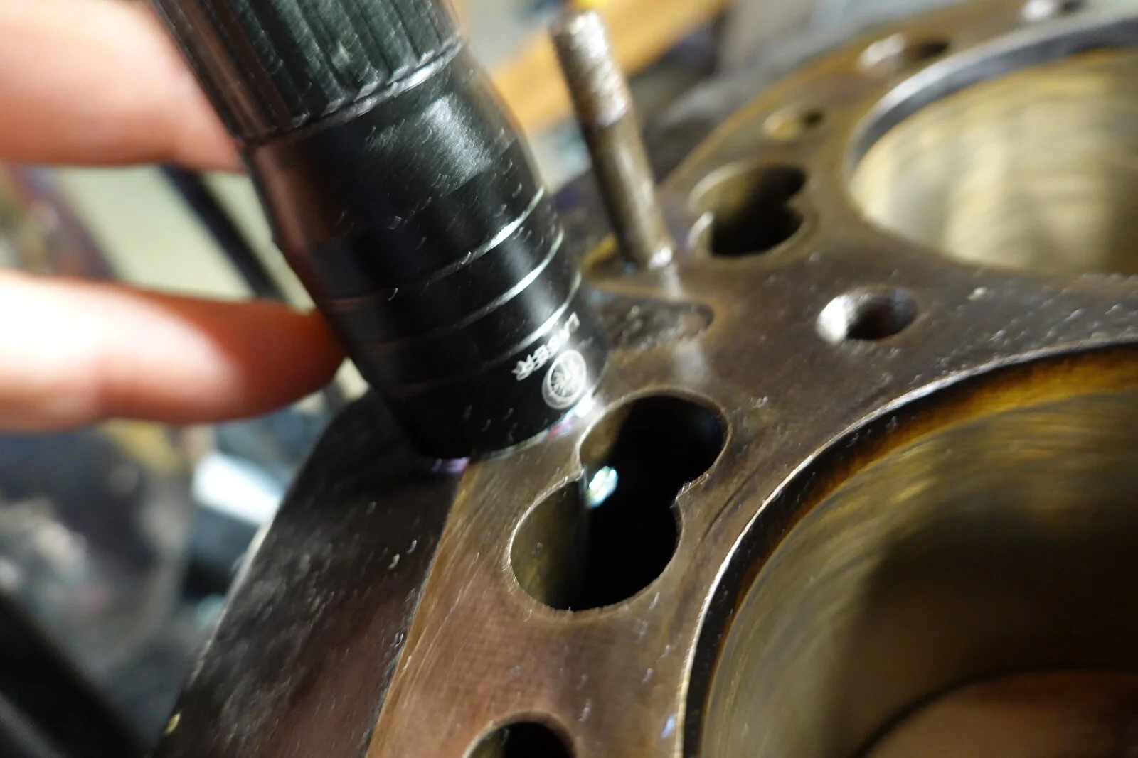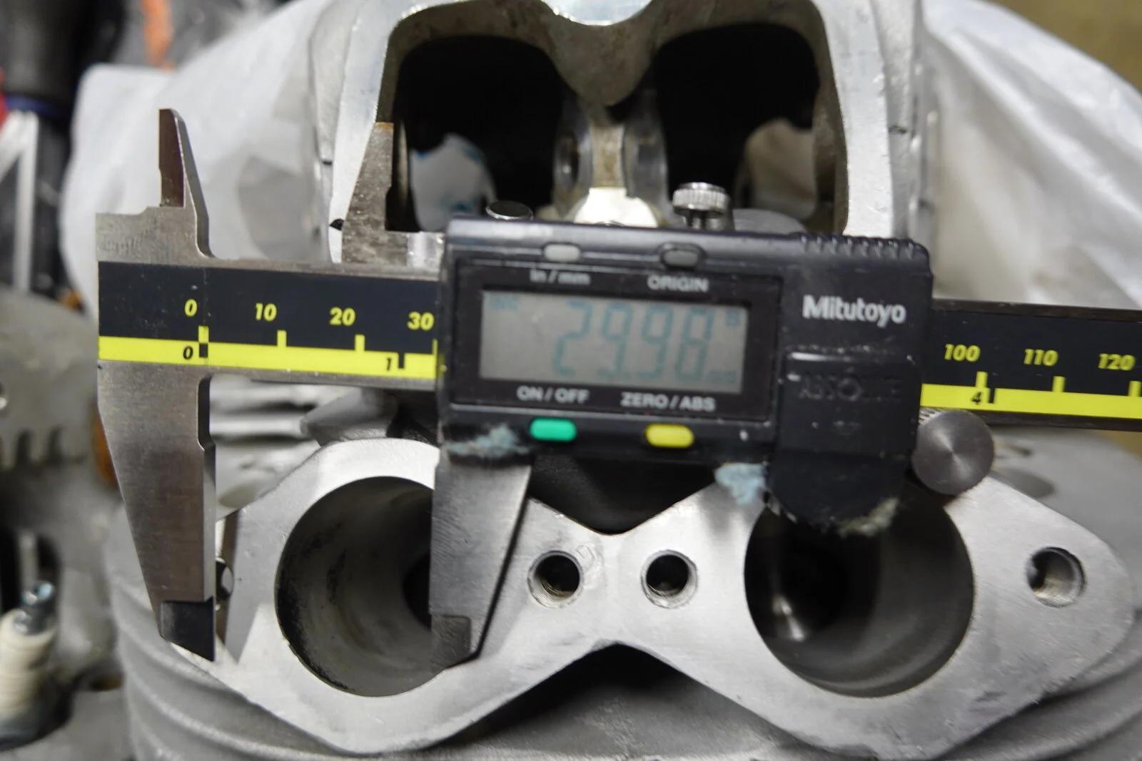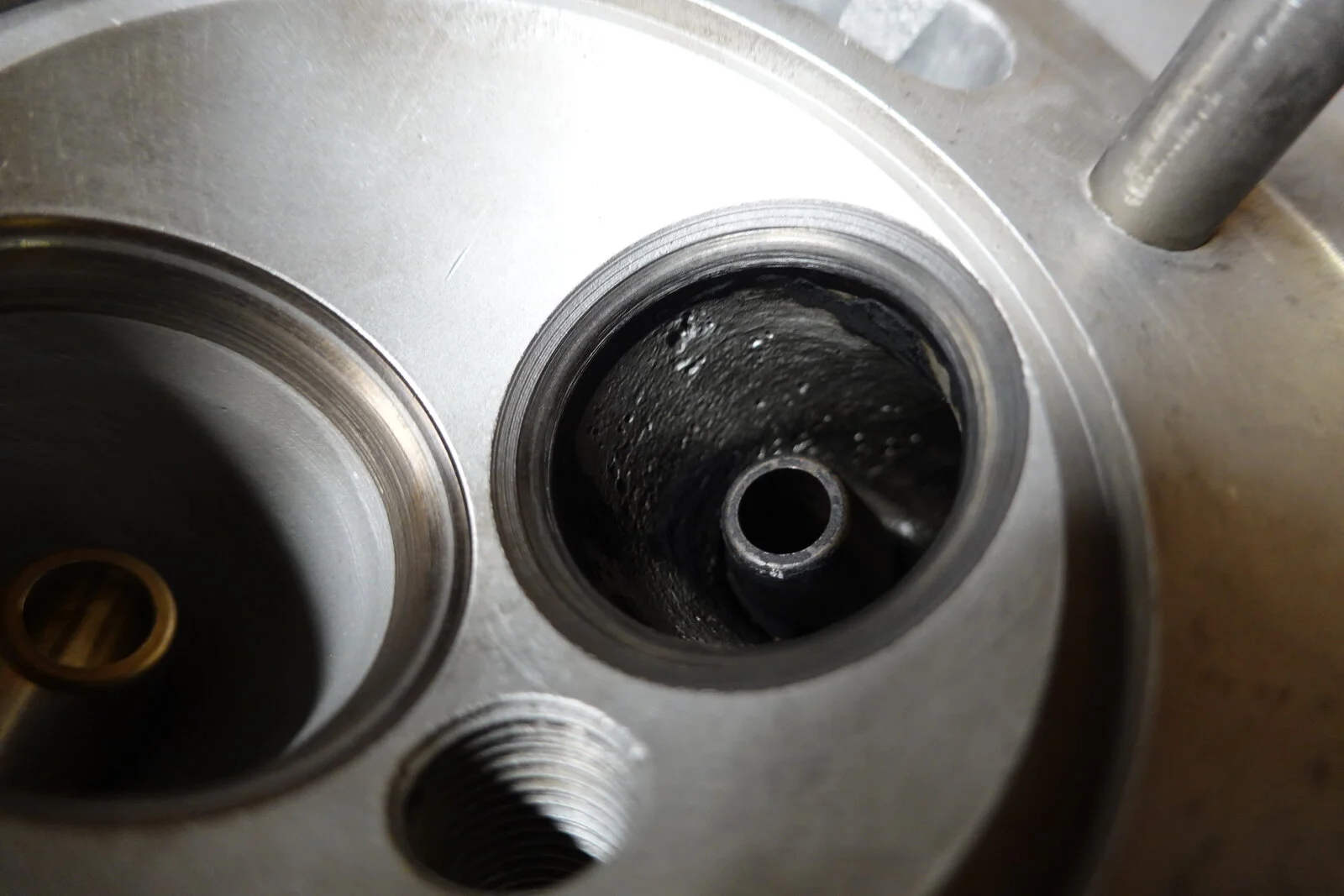 I bought this MK III about 4 years ago with gearbox and wiring problems. It always smoked at start up on left side. If you started it and just backed it out of the garage, shut it off more than a minute or two, and restarted it really smoked! It didn't foul the plug so I put up with it until it started leaking around the push rod area. It misted the left side of the bike if run aggressive. Front center head stud was loose and the small studs were not sealed and one was into the push rod "tube". After disassembly I was surprised that it had a fresh bore .040 over. At this point I should mention that it is a RH 4 head that has been ported. It looks like the left intake seal was moving up and down with the valve. With all the rumors involved with these heads I'm thinking of replacing the left valve guides in case this is also where the oil is seeping from. The valve guide support in the head has been shortened from the porting. See pics, the first head is the ported RH4 and the second is a RH 10 for comparison. I hate to put a good RH 10 on an everyday rider. Trip to the machine shop tomorrow and ask his input and check things for cracks. And yes that is a crack in the barrel. Apparently dropped. I don't see that it will be a problem.